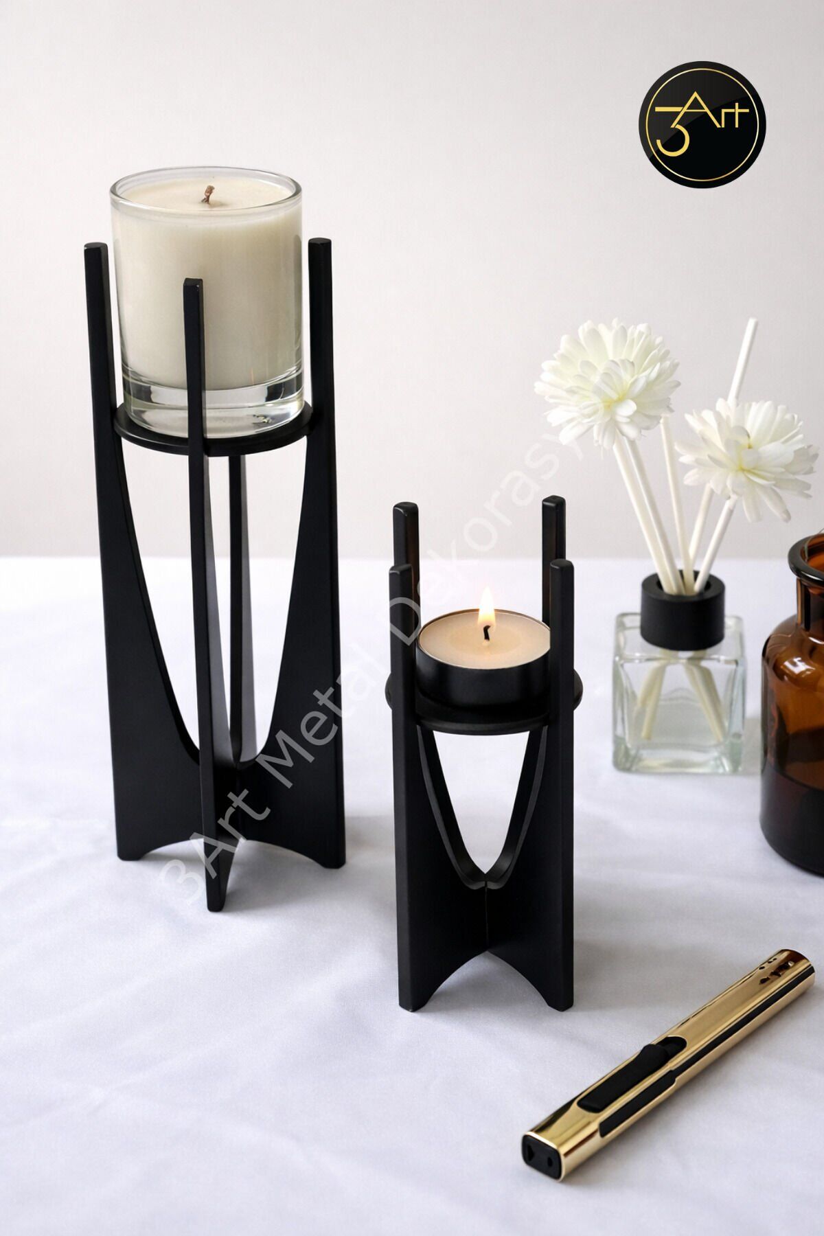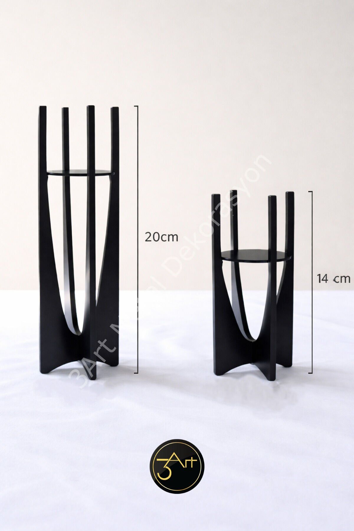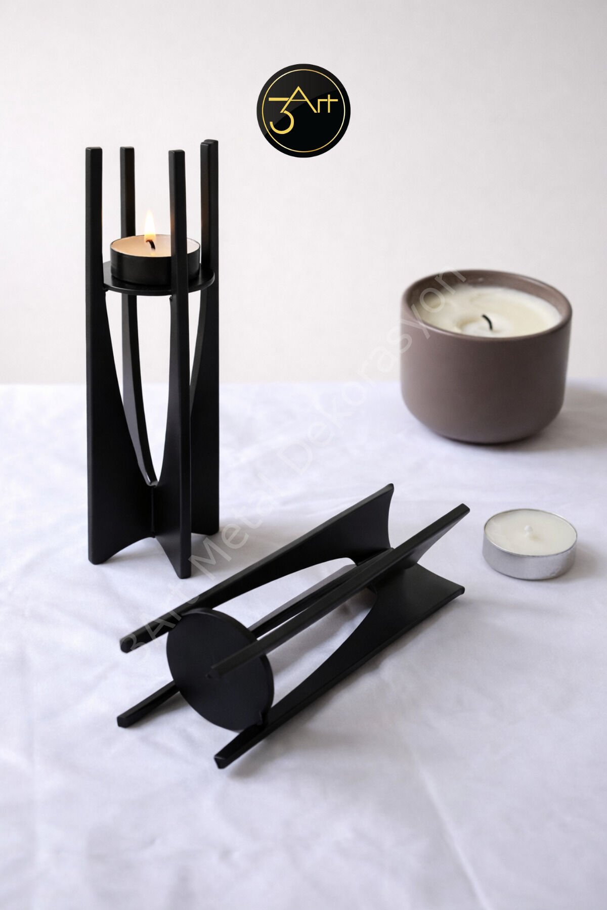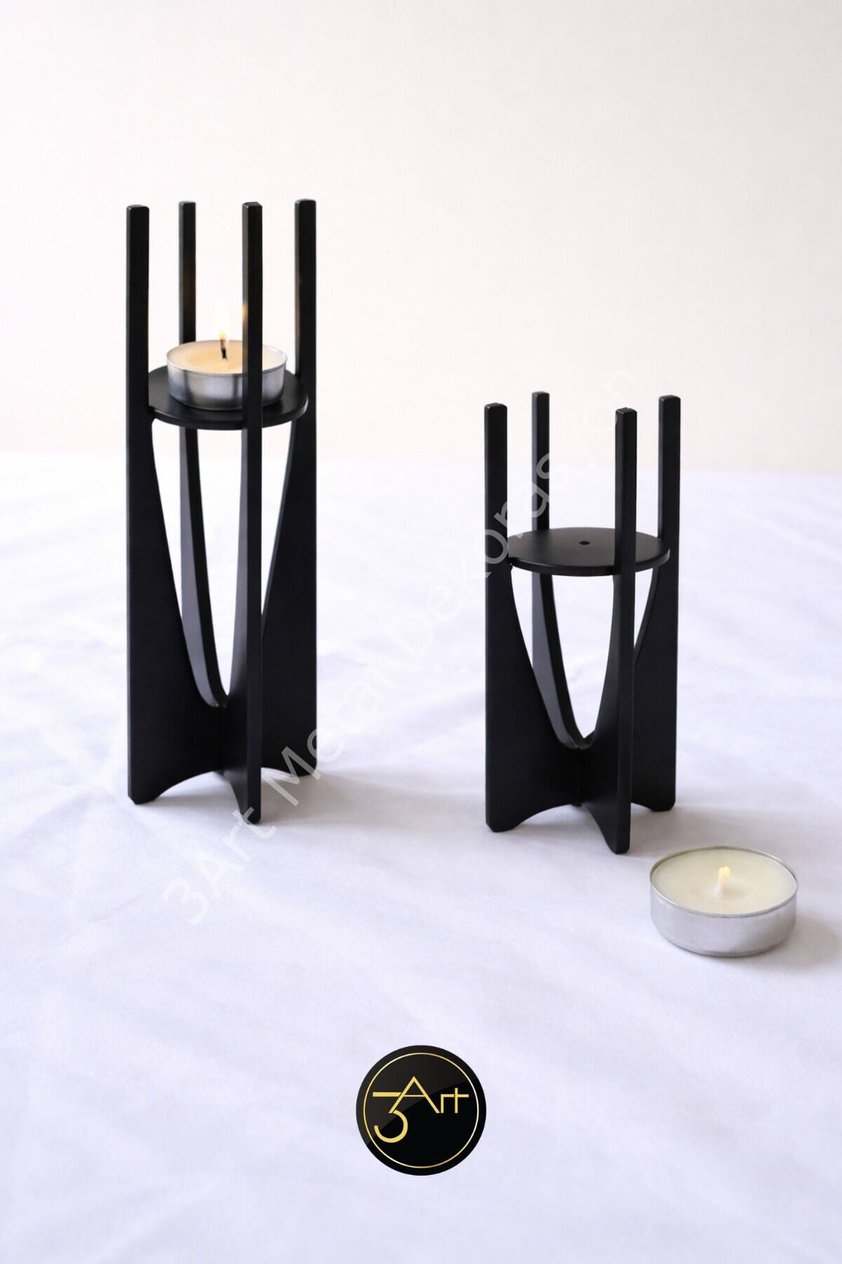 - Modern tasarımıyla salon, masa ve hediye dekoru için ideal bir seçenek sunar.; - Dayanıklı metal malzemeden üretilmiş olup uzun ömürlü kullanım vaat eder.; - Set içeriğinde yer alan 2 adet mumluk ile dekorasyonunuzu kolayca tamamlayabilirsiniz.; - Şık siyah rengiyle her türlü iç mekan dekorasyonuna uyum sağlar.; - 14 x 20 cm boyutlarındaki bu mumluklar, hem küçük hem de büyük mumlar için uygundur.; - Türkiye'de üretilmiş olup, yerel üretim desteklenmiş olur.; - 3art metal dekorasyon güvencesiyle kaliteli ve estetik bir deneyim sunar.; - Üretici ve birincil ithalatçı olarak 3art metal dekorasyon, müşteri memnuniyetine önem verir.