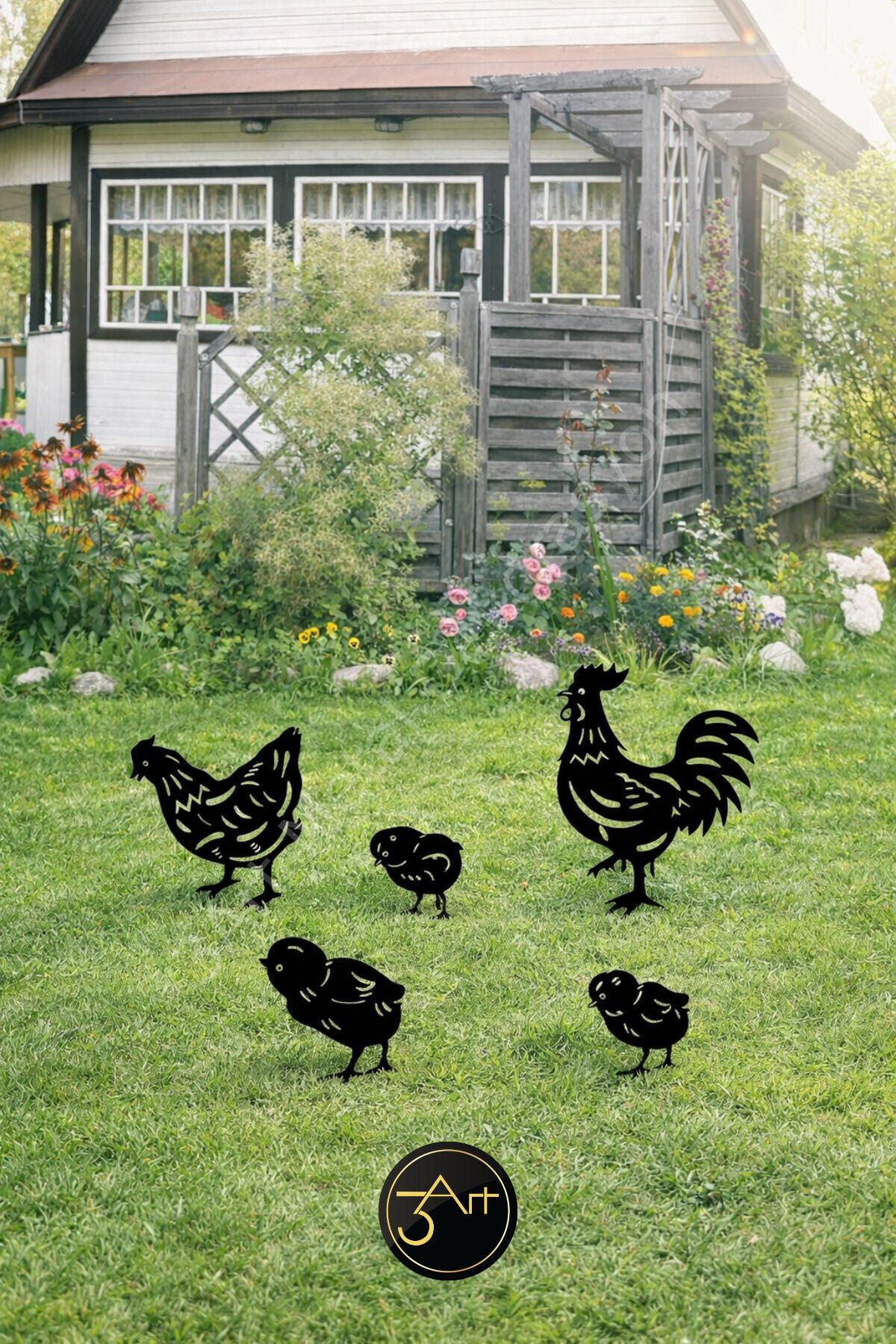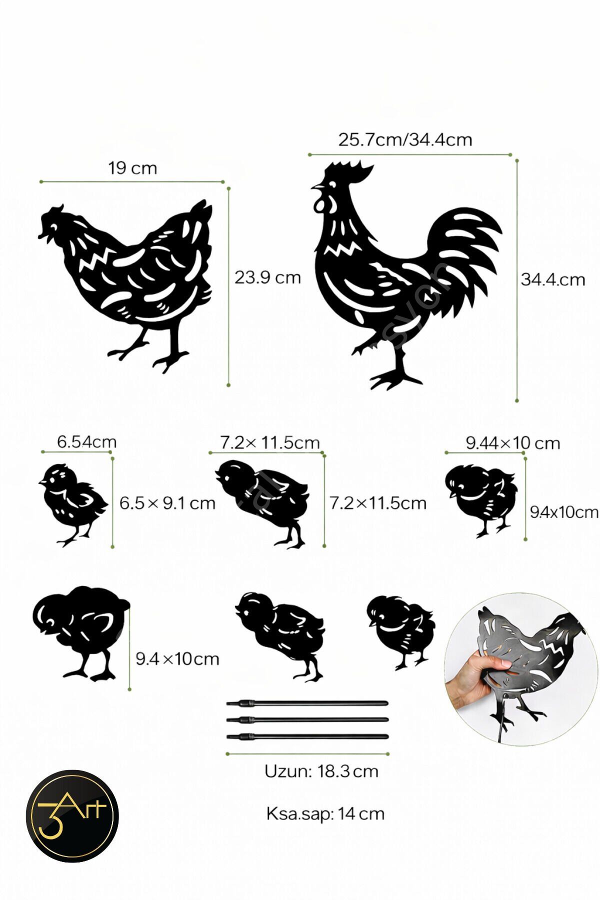 - Modern tasarımıyla dikkat çeken asimetrik şekli, bahçenize şık bir dokunuş katıyor.; - Dayanıklı metal materyali sayesinde uzun ömürlü kullanım sunar ve hava koşullarına karşı dirençlidir.; - Her biri 20-25 cm boyutunda olan bu dekoratif tavuk ailesi, bahçenizin atmosferini canlandırır.; - 2-3 kg ağırlığındaki bu set, kolayca taşınabilir ve yerleştirilebilir; böylece bahçenizde istediğiniz yere rahatça koyabilirsiniz.; - Nemli bir bezle kolayca temizlenebilir olması, bakımını pratik ve zahmetsiz hale getirir.; - 5 parçadan oluşan set içeriği ile bahçenize çeşitlilik kazandırır ve estetik bir görünüm sağlar.; - 25-30 cm yüksekliğindeki bu dekoratif tavuklar, çim ve peyzaj alanlarınıza görsel zenginlik katar.; - Türkiye'de üretilen bu ürün, yerel işçiliği desteklerken kaliteli malzemeden yapılmıştır.;