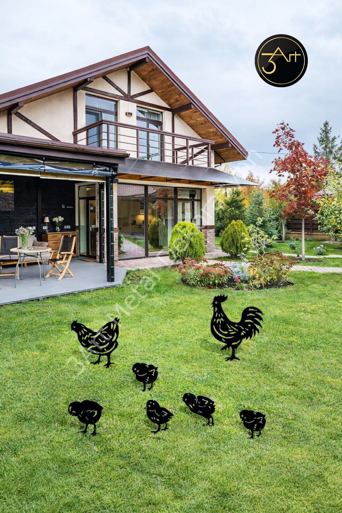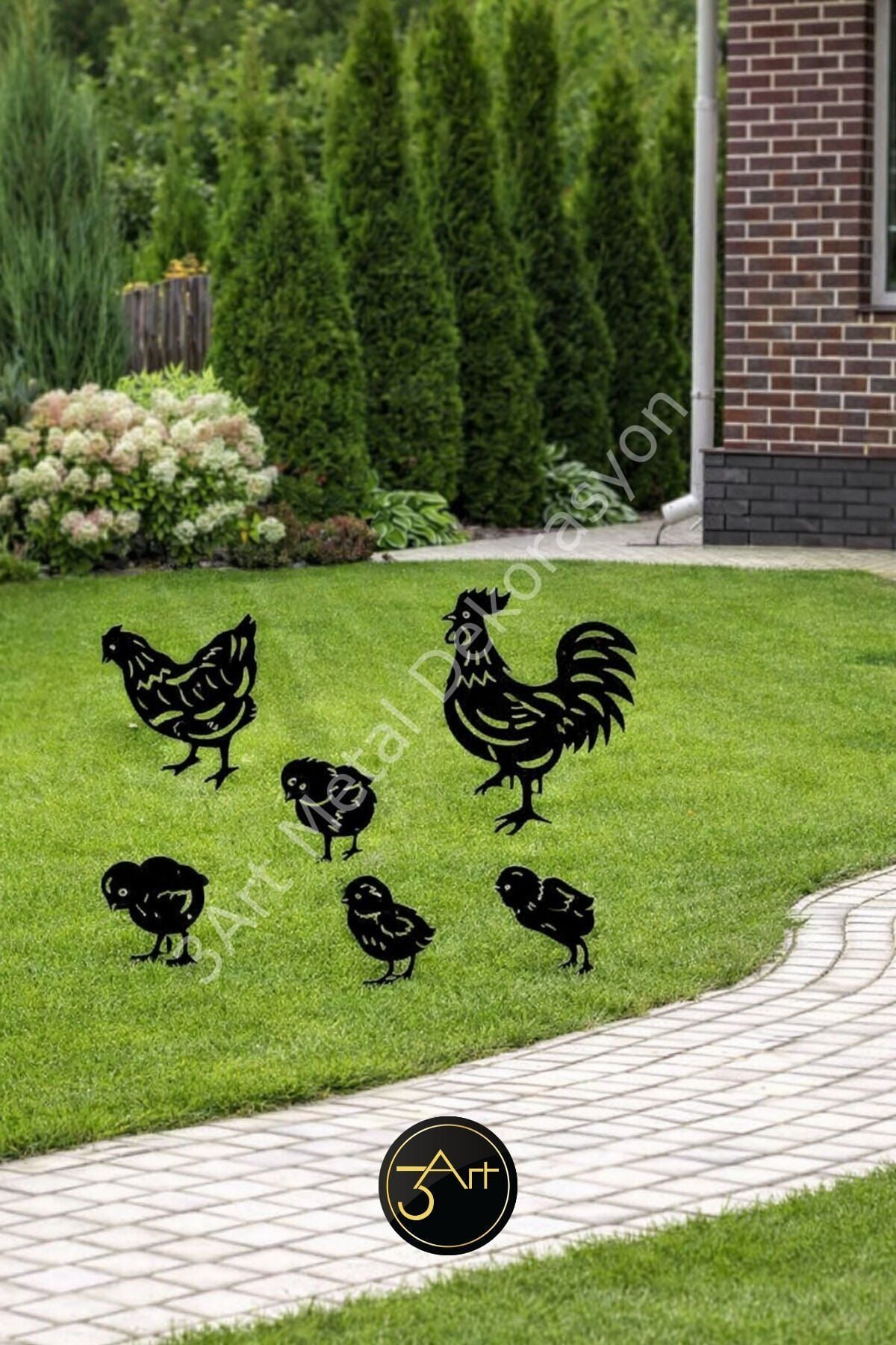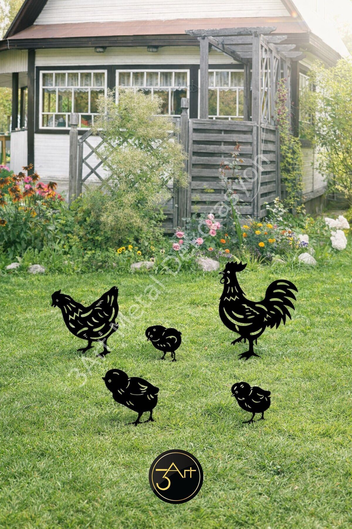 - Modern tasarımıyla dikkat çeken asimetrik şekli, bahçenize şık bir dokunuş katıyor.; - Dayanıklı metal materyali sayesinde uzun ömürlü kullanım sunar ve hava koşullarına karşı dirençlidir.; - Her biri 20-25 cm boyutunda olan bu dekoratif tavuk ailesi, bahçenizin atmosferini canlandırır.; - 2-3 kg ağırlığındaki bu set, kolayca taşınabilir ve yerleştirilebilir; böylece bahçenizde istediğiniz yere rahatça koyabilirsiniz.; - Nemli bir bezle kolayca temizlenebilir olması, bakımını pratik ve zahmetsiz hale getirir.; - 5 parçadan oluşan set içeriği ile bahçenize çeşitlilik kazandırır ve estetik bir görünüm sağlar.; - 25-30 cm yüksekliğindeki bu dekoratif tavuklar, çim ve peyzaj alanlarınıza görsel zenginlik katar.; - Türkiye'de üretilen bu ürün, yerel işçiliği desteklerken kaliteli malzemeden yapılmıştır.;