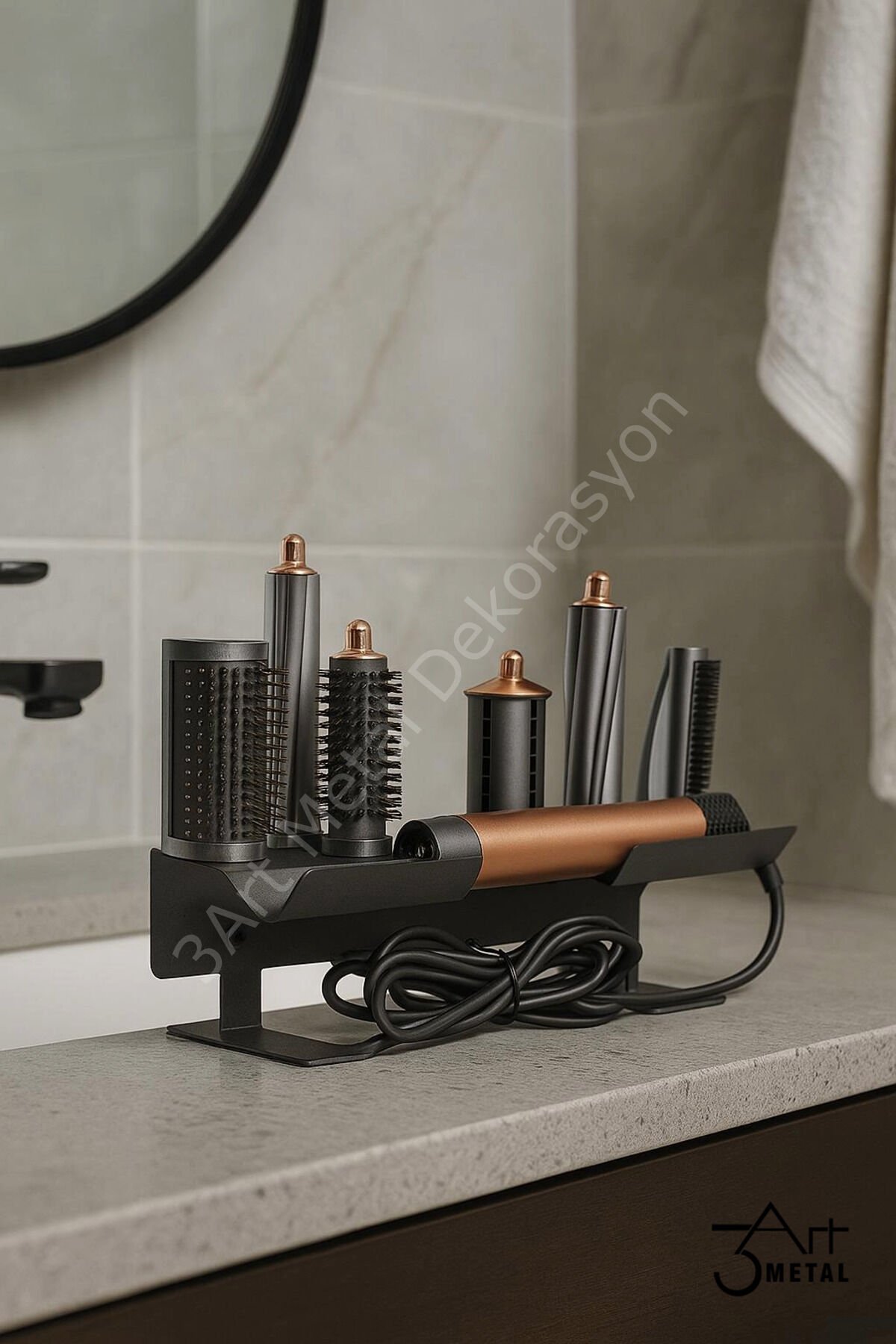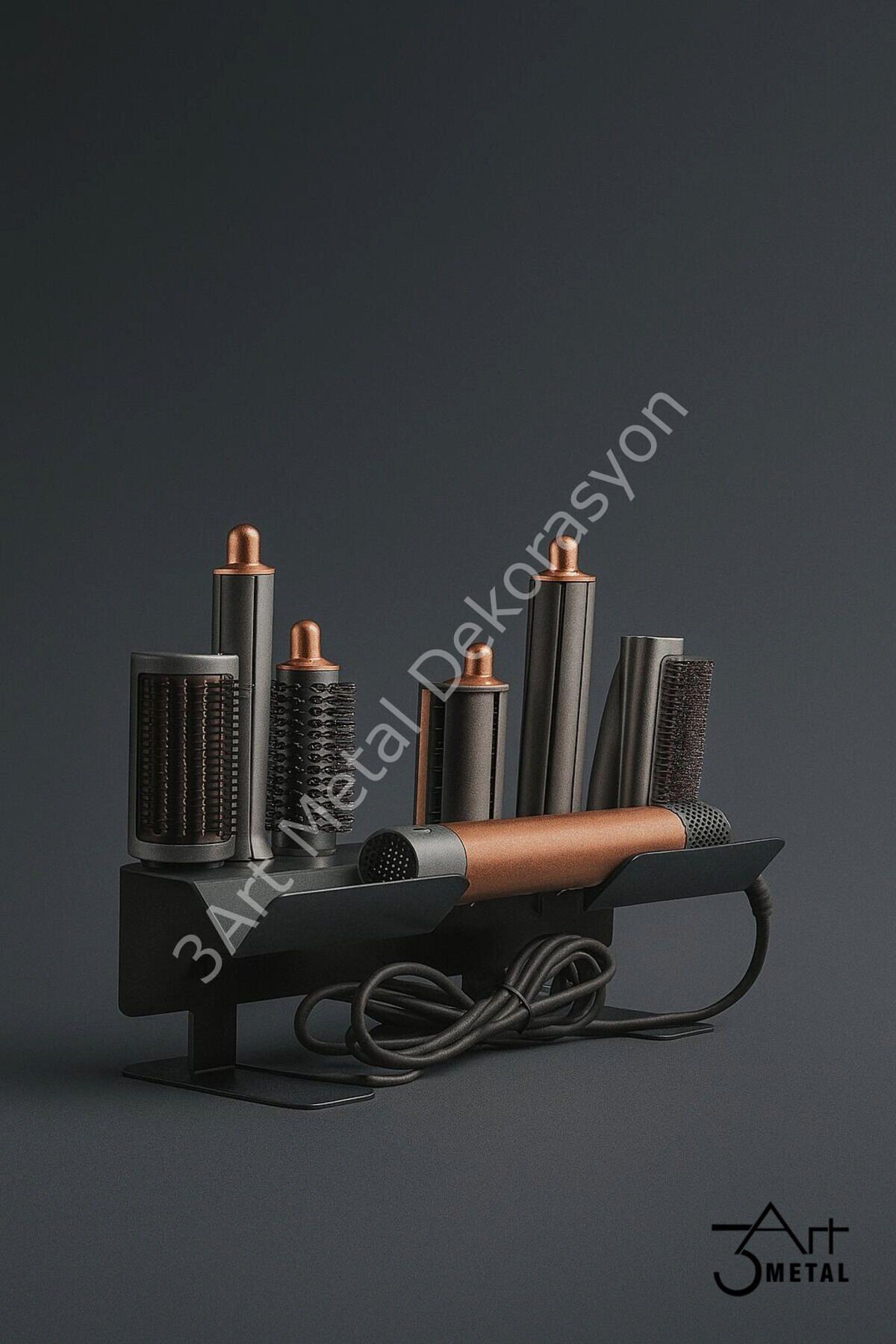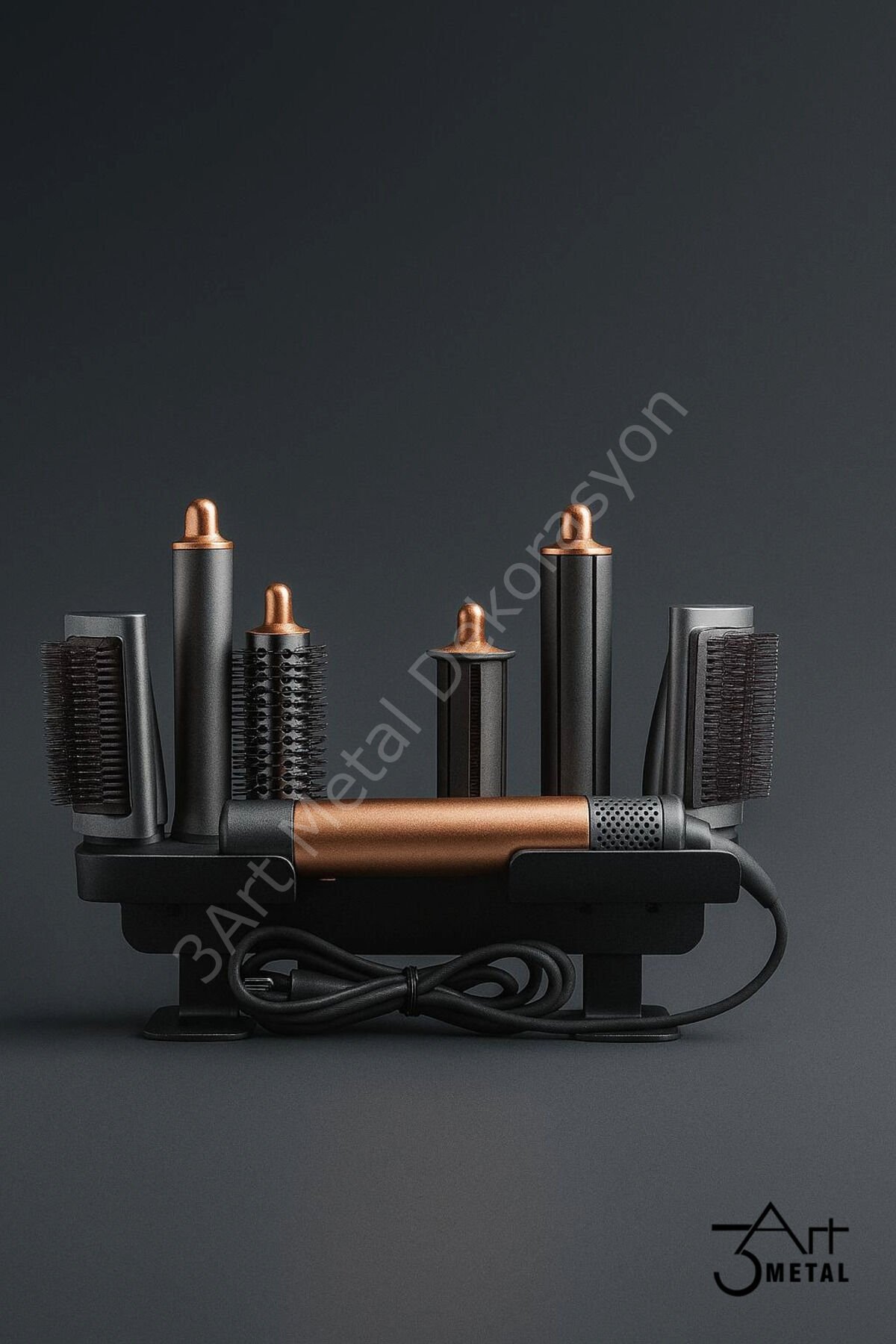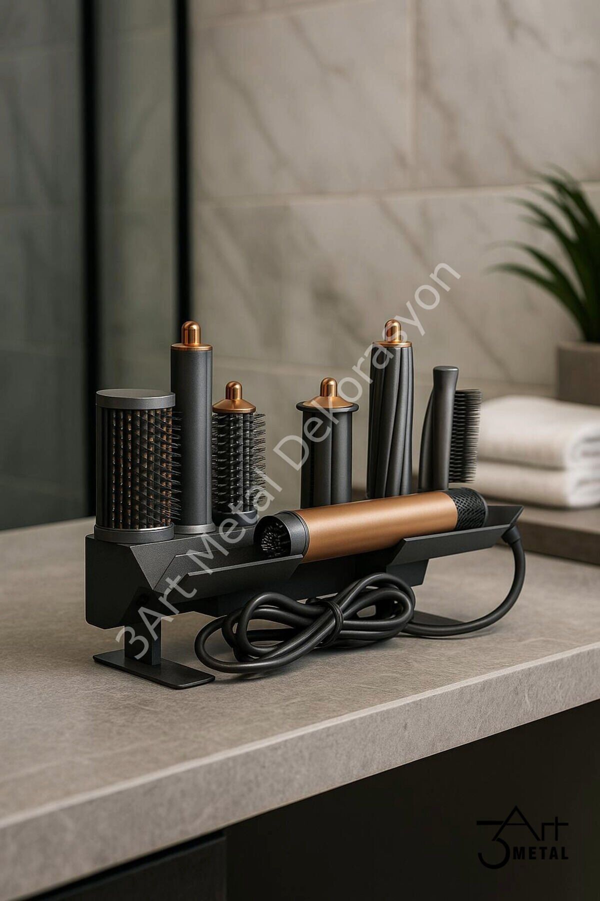 - Airwrap™ Multi-Styler Metal Saç Şekillendirme Standı, şık tasarımıyla banyonuzda estetik bir dokunuş sağlar.; - Antrasit rengiyle modern ve zarif bir görünüm sunar, her türlü banyo dekorasyonuyla kolayca uyum sağlar.; - Üreticisi 3art metal dekorasyon olan bu ürün, kaliteli malzemeden üretilmiş olup dayanıklılığı ile ön plana çıkar.; - İthalatçı/Yetkili Temsilci/İfa Hizmet Sağlayıcısı olarak 3art metal dekorasyon tarafından sunulan bu ürün, güvenilir bir hizmetle desteklenir.; - Türevi saç şekillendirici cihazlara uyumlu olması sayesinde farklı şekillendirme ihtiyaçlarınıza cevap verir; hem maşa hem de fön başlığı ile kullanım imkanı tanır.; - Bakım talimatlarına uygun olarak nemli bir bezle silerek kolayca temizlenebilir; böylece uzun süre ilk günkü görünümünü korur.; - Siyah renk seçeneğiyle modern ve sofistike bir stil sunarken, türevi saç şekillendirici cihazlarla tam uyumluluğu sağlar.