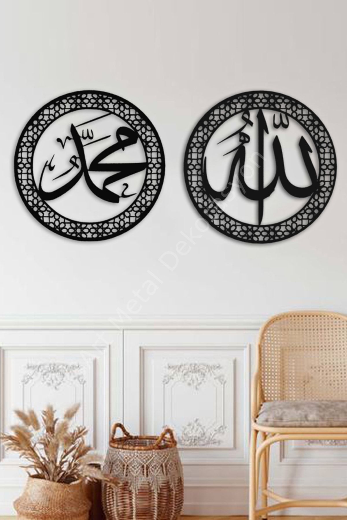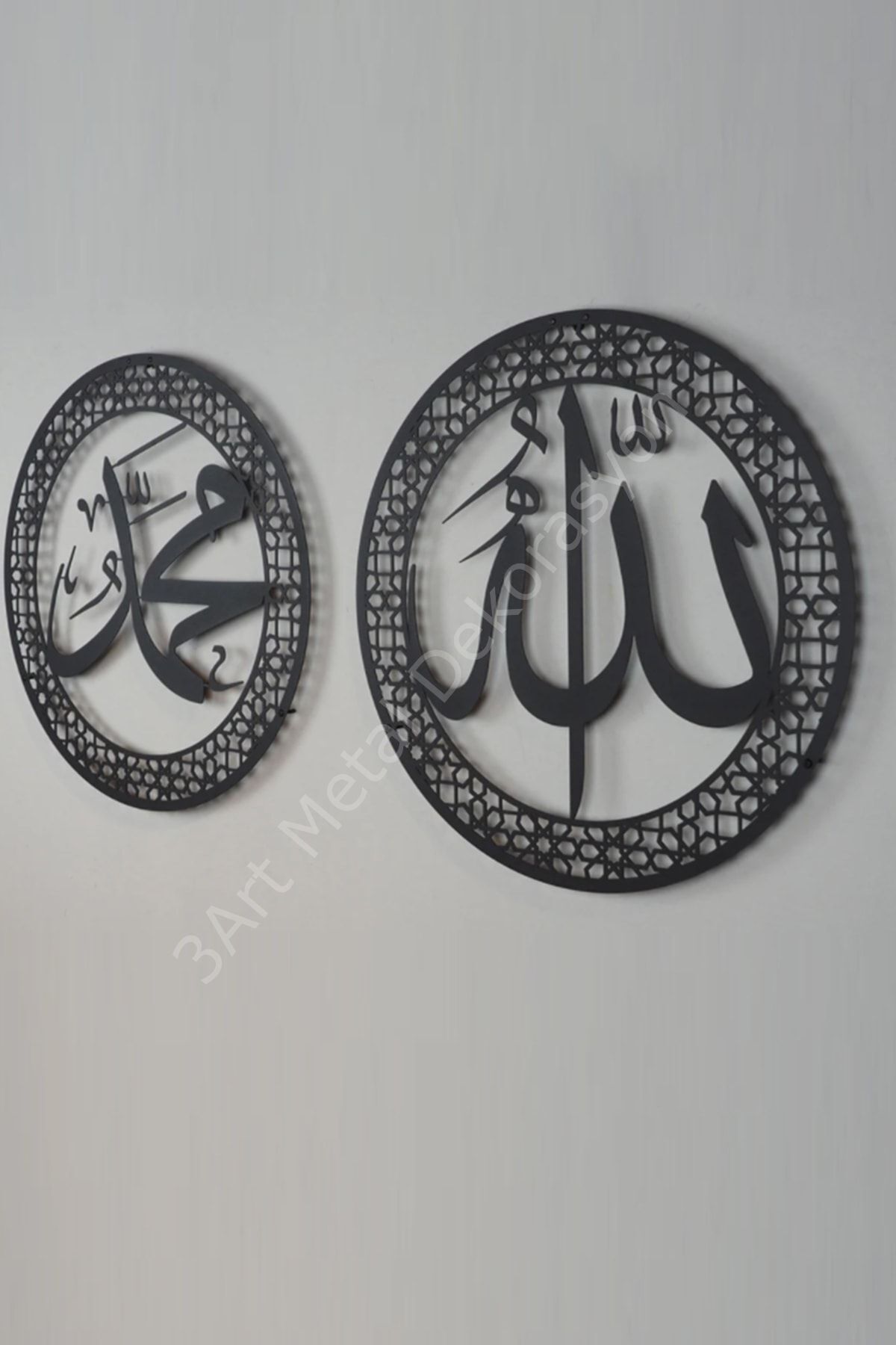 - İslam kültürünün sembolik unsurlarını evinize taşıyan bu metal tablolar, Allah ve Muhammed isimlerini siyah renkte ve 50x50 cm boyutlarında sunarak dikkat çekici bir dekoratif obje oluşturur.; - Dayanıklı metal malzemesi sayesinde uzun ömürlü kullanım vaat ederken, siyah rengiyle her türlü iç mekan tasarımına kolayca uyum sağlar.; - İki adet tablodan oluşan set halinde sunulan bu ürünler, hem kişisel kullanım hem de hediye olarak idealdir; sevdiklerinizle paylaştığınızda anlamlı bir hatıra bırakır.; Yüksek kaliteli metal malzeme kullanılarak üretilmiş, uzun ömürlü ve dayanıklı bir yapıya sahiptir; İslami sanatın özgün tasarımlarıyla süslenmiş, manevi değerleri yansıtan estetik bir görünüm sunar; Duvar dekorasyonunuza derinlik katan bu set, mekanınıza huzurlu ve dingin bir atmosfer katmak için idealdir; İki parçadan oluşan set, hem Allah hem de Muhammed (s; a; v; ) isimleriyle birlikte manevi bir bütünlük sağlar; Metal malzeme sayesinde nem ve suya karşı dayanıklıdır, böylece dış mekan kullanımına uygunluk gösterir;