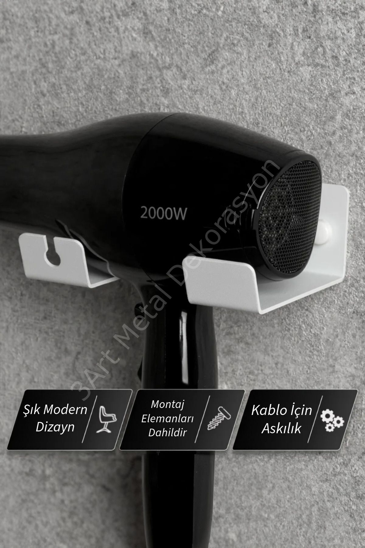 3artmetal'in şık saç kurutma makinesi tutucusu banyonuz için gerekli bir aksesuardır. Saç kurutma makinesi tutucusu organik ve modern görünüyor. 2 mm kalınlığında yüksek kaliteli ve dayanıklı metalden yapılmış ve toz boya ile kaplanmış olup, neme karşı güvenilir koruma ve uzun ömür sağlar. Montaj delikleri vardır (kit, bağlantı elemanlarını maskelemek için bağlantı elemanları ve tapalar içerir). Ayrıca saç kurutma makinesine güvenli bir şekilde oturmasını sağlayan kablo için bir kesik de bulunmaktadır. Minimalist tasarımı sayesinde her türlü iç mekana (hem klasik hem de modern) mükemmel uyum sağlar. İlave bakım gerektirmez, kirden temizlenmesi kolaydır. ; Malzeme: Yüksek kaliteli paslanmaz demir sac ; Ölçüler: Genişlik 14 cm, yükseklik 5 cm, derinlik: 9 cm ; Kanca sayısı 2 adetten oluşmaktadır. ; Aşınmaya dayanıklı elektrostatik toz boya ile üretilir. ; Detaylara ve hassas kaynaklara büyük özen gösterilerek yapılmıştır. ; Tek parça şeklinde gönderim sağlanır. ; Paket içeriğine asmaya yardımcı vida ve dübel dahildir. ;