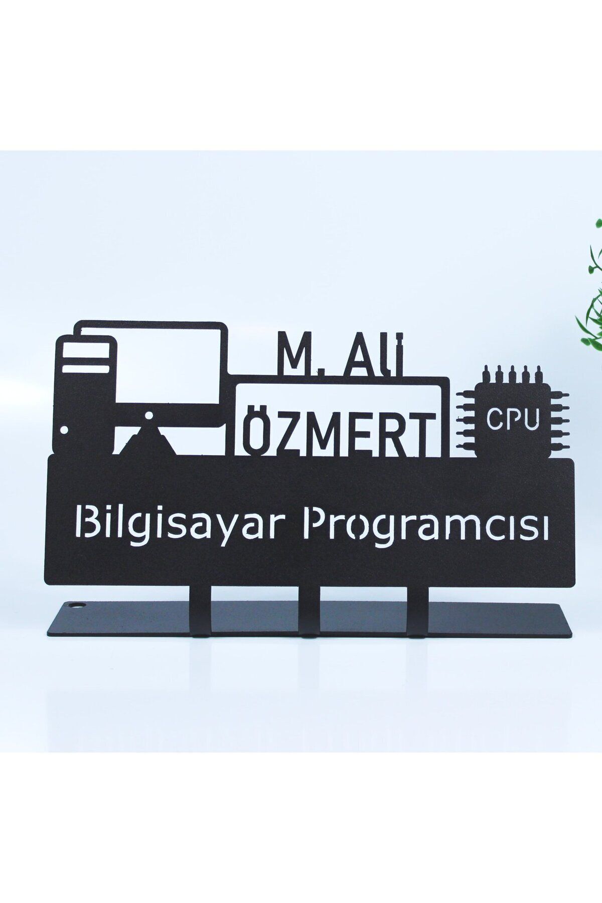 - Siyah renkteki metal malzemesiyle şık ve profesyonel bir görünüm sunar, ofisinizin dekorasyonuna modern bir dokunuş katar.; - 20x20 cm boyutlarındaki bu masaüstü isimlik, hem küçük hem de büyük çalışma alanlarına kolayca uyum sağlar ve yer kaplamaz.; - Tek ebat tasarımı sayesinde standart masa ölçülerine mükemmel şekilde oturur ve kullanım kolaylığı sağlar.; - Bilgisayar programcısı temalı tasarımı ile mesleğinize özel bir hediye seçeneği olarak da tercih edilebilir; hem işlevsel hem de anlamlı bir aksesuar olur.
