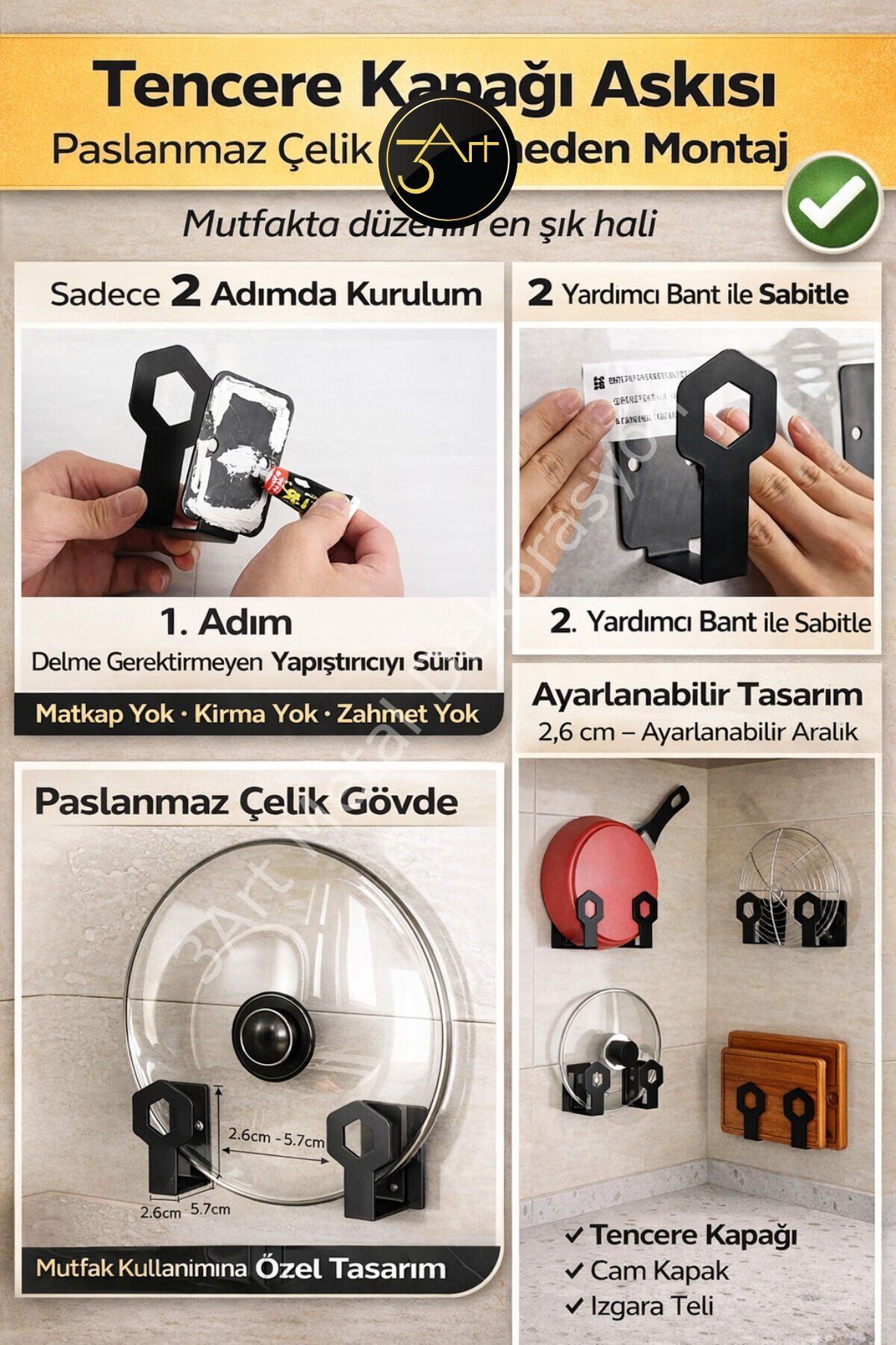 - Klasik tasarımıyla mutfak dekorasyonunuza şık bir dokunuş ekler.; - Ayarlanabilir yapısı sayesinde farklı boyutlardaki tencere kapaklarına uyum sağlar.; - Paslanmaz çelik malzemesi ile dayanıklılık ve uzun ömür sunar.; - Duvara monte edilebilir özelliğiyle yerden tasarruf sağlar ve mutfakta ekstra alan yaratır.; - Metal materyali sayesinde sağlam bir kullanım imkanı tanır.;