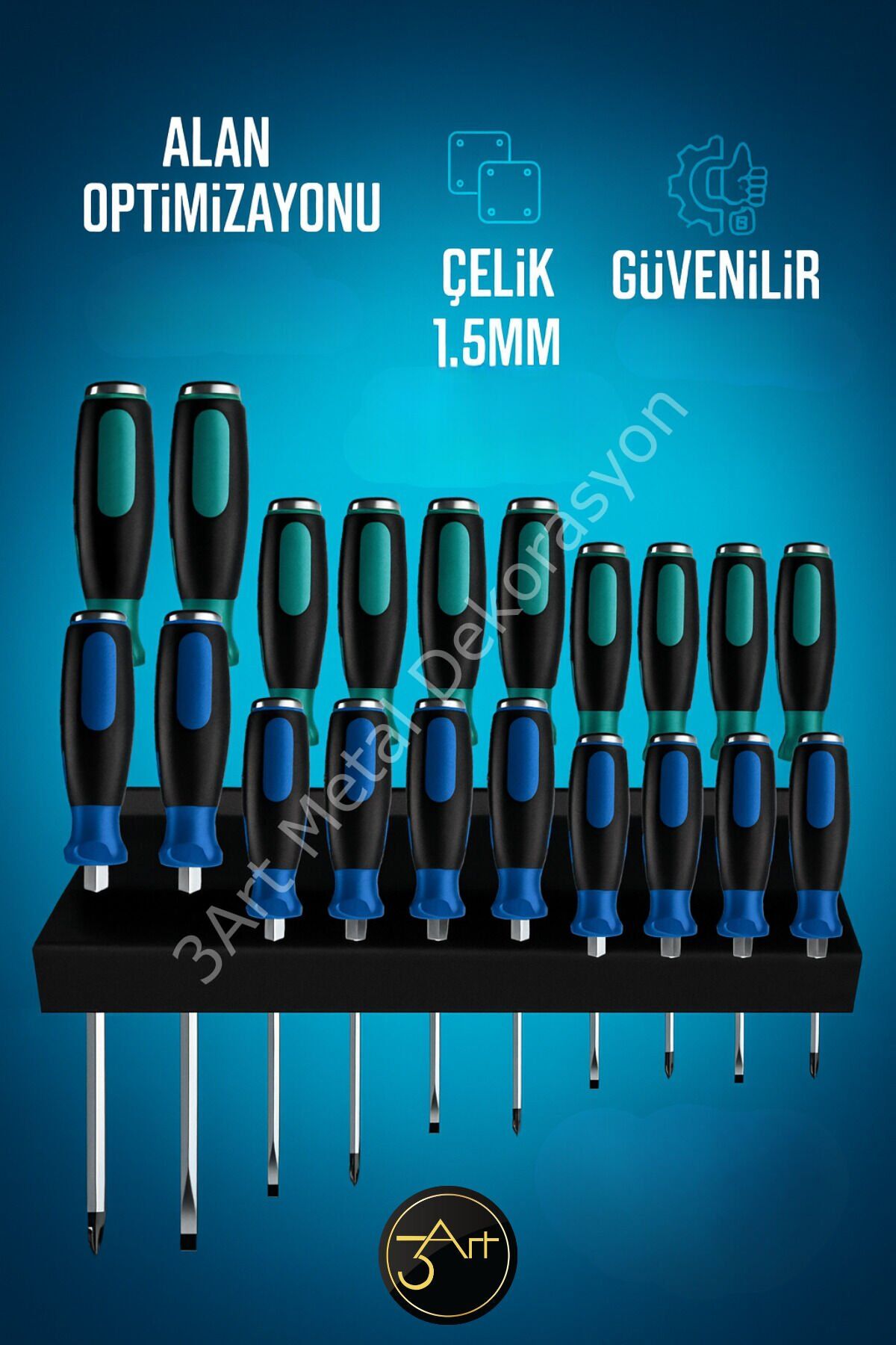 - Dayanıklı metal malzeme kullanılarak üretilmiş, uzun ömürlü ve sağlam bir kullanım sunar.; - Dolap içi düzenleyici olarak tasarlanmıştır, böylece tornavidalarınızı kolayca saklayabilir ve düzenli bir çalışma alanı oluşturabilirsiniz.; - Türkiye'de üretilmiştir, yerel üretim avantajlarıyla kaliteli ve güvenilir bir ürün sunar.; - Takım düzenleyici raf özelliği ile tornavida takımınızı düzenli bir şekilde saklamanızı sağlar, böylece ihtiyacınız olan araca hızlıca erişebilirsiniz.;