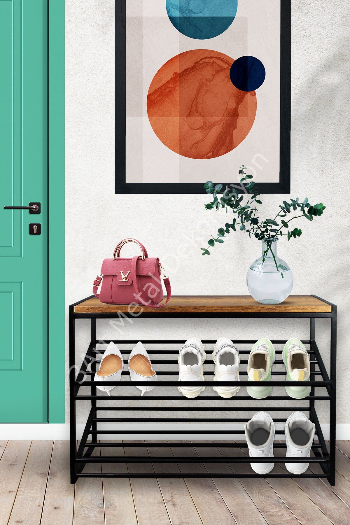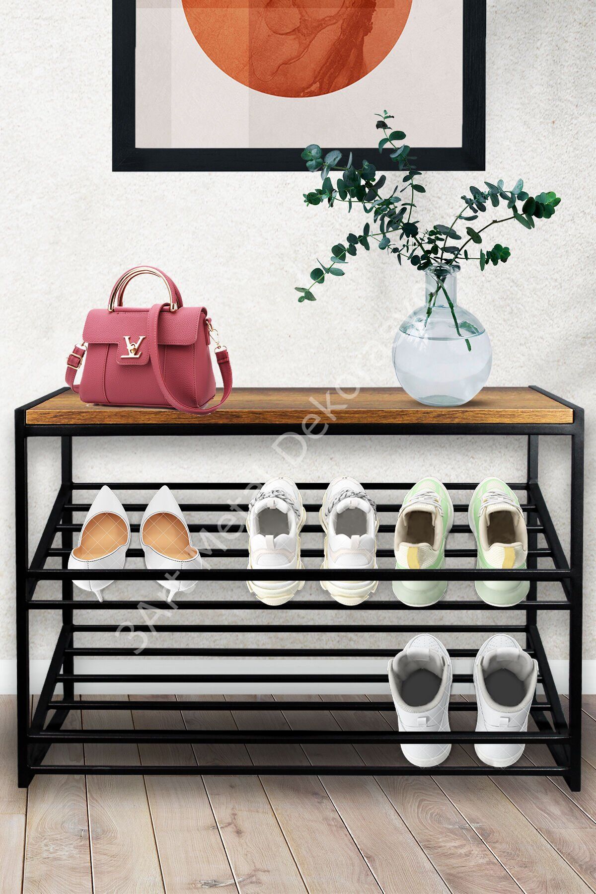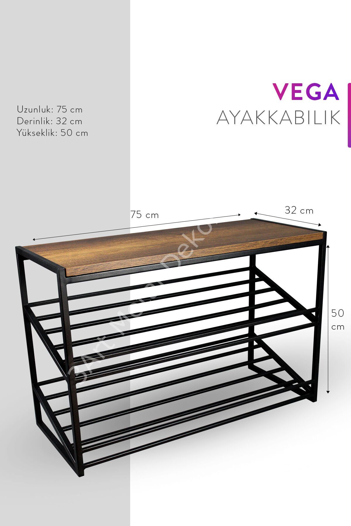 3 adet bölümden oluşan ayakkabılık; 50 CM yükseklik, 75 CM genişlik, 32 CM derinlik ölçüleri ile tasarlanmıştır. ; Darbelere karşı yüksek koruma sağlayan metal malzemeler ile üretimi yapılmıştır. Kırılma, çizilme, bükülme işlemi olmadan uzun süre aynı kalitede kullanabilirsiniz. ; Toplamda 9 çift ayakkabı alma kapasitesi mevcuttur. Her rafına üçer çift ayakkabı yerleştirebilirsiniz. ; En üst bölümünde ahşap malzemeden üretilen bir adet raf bulunur. Buraya dekoratif eşyalarınızı koyabilirsiniz. ; Suya ve neme karşı dayanıklı yapısı sayesinde kabarma ve şişme yapmaz. Nemli ve rutubetli alanlarda kullanıma uygundur. ; MDF ahşap materyal ve demir profil birleşimi ile dayanıklı bir kullanım vadeder. Böylelikle kalitesini bulunduğu ortama yansıtır.; Aşınmaya karşı dayanıklı olan elektrostatik toz boya ile boyanır. Bu nedenle boyasında sökülme gibi olumsuz durumların önüne geçilir.; Tasarım detaylarına dikkat ederek üretimi tamamlanır. Bu sayede bakımlı ve kaliteli görünümü aynı kalır.; Monte olarak gönderileceği için kurulumunun yapılması gerekmez. Direkt olarak kullanmaya başlayabilirsiniz. ; Hem iç mekanlarda hem de dış mekanlarda kullanıma uygunluk gösterir. Hol, antre, koridor, balkon, bahçe, banyo, mutfak gibi çeşitli alanlarda konumlandırılabilir. ; Yüksek rafları sayesinde uzun boyuttaki eşyaları da yerleştirebilmeniz mümkün olur. ; Ayakkabılık olarak kullandığınızda en üst bölümüne çizme gibi daha uzun boyutlu ayakkabılarınızı yerleştirebilirsiniz.;