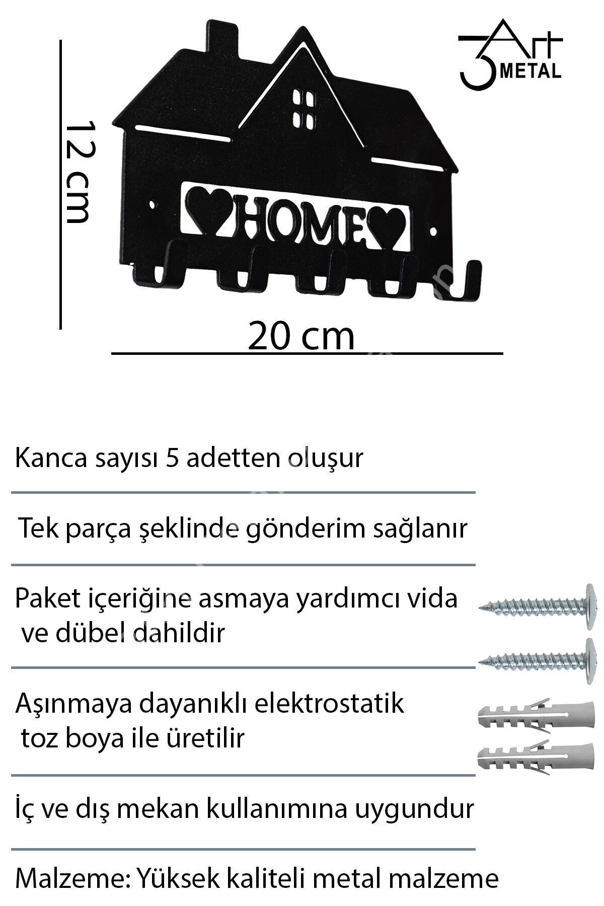 - Duvara monte edilebilen tasarımı ile mekanınıza modern ve şık bir dokunuş katar.; - 12 cm yüksekliği, anahtarlarınızı kolayca asmanız için ideal boyuttadır.; - Dayanıklı metal materyali sayesinde uzun ömürlü kullanım sunar.; - 20 cm genişliğiyle geniş bir alan sağlayarak anahtarlarınız için rahat saklama imkanı tanır.; - Canlı turkuaz rengiyle evinizin dekorasyonuna renk katarken, aynı zamanda pratik bir çözüm sunar.; - Dayanıklı metal malzeme kullanımı, uzun ömürlü ve sağlam bir yapı sunar; - Duvara monte edilebilir tasarımı sayesinde yerden tasarruf sağlar ve mekanınızda şık bir dekoratif unsur oluşturur; - Metal anahtar askılığı, anahtarlarınızı düzenli ve kolayca erişilebilir tutmanız için idealdir; - metal duvar askılığı, siyah askılık, banyo havlu askısı, çelik duvar askı, mutfak askılığı, kapı arkası askı, modern askılık, çanta askısı, lazer kesim askı, anahtarlık askılığı, dekoratif duvar askısı, mat siyah metal askılık, organizer askı