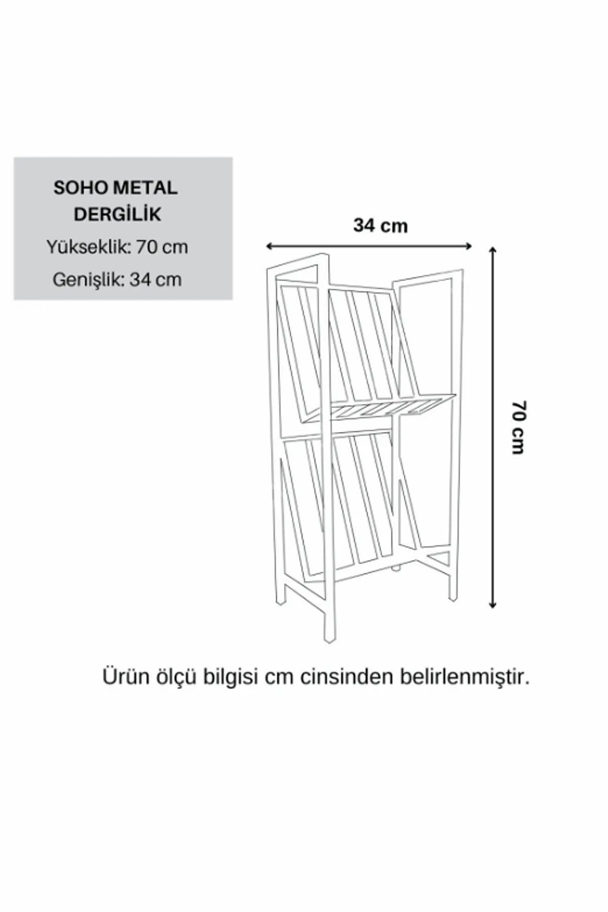 - Modern tasarımıyla dikkat çeken dekoratif metal gazetelik, evinizin veya ofisinizin atmosferini zenginleştirir.; - 70 x 30 cm boyutlarındaki bu düzenleyici, hem gazete hem de dergilerinizi kolayca saklamanızı sağlar.; - Dayanıklı metal malzemesi sayesinde uzun ömürlü kullanım sunar ve sık kullanıma karşı dirençlidir.; - Hem kitap rafları hem de gazetelik olarak kullanılabilen bu ürün, çok yönlülüğü ile pratik bir çözüm sunar.; Malzemeler: Yüksek kaliteli paslanmaz demir profil; Ölçüler: Genişlik 34 cm, derinlik 20 cm, yükseklik 70 cm ; sipariş oluşturduktan sonra renk belirtebilirsiniz ; Aşınmaya dayanıklı elektrostatik siyah toz boya ile üretilir.; ; Detaylara ve hassas kaynaklara büyük özen gösterilerek yapılmıştır.; ; Tamamen el yapımıdır.; ; Tek parça halinde gönderim sağlanır.; ;