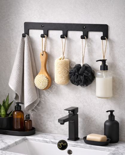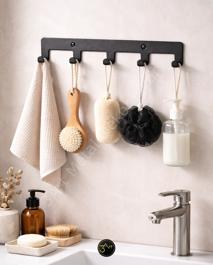 Dayanıklı demir malzemeden üretilmiş bu banyo askısı, duvara monte edilerek yer tasarrufu sağlar. 5 sağlam kanca ile havlu ve elbiselerinizi düzenli tutar. Şık ve pratik tasarımı sayesinde banyonuza estetik katarken kullanım kolaylığı sunar. Her banyoya uyum sağlar.