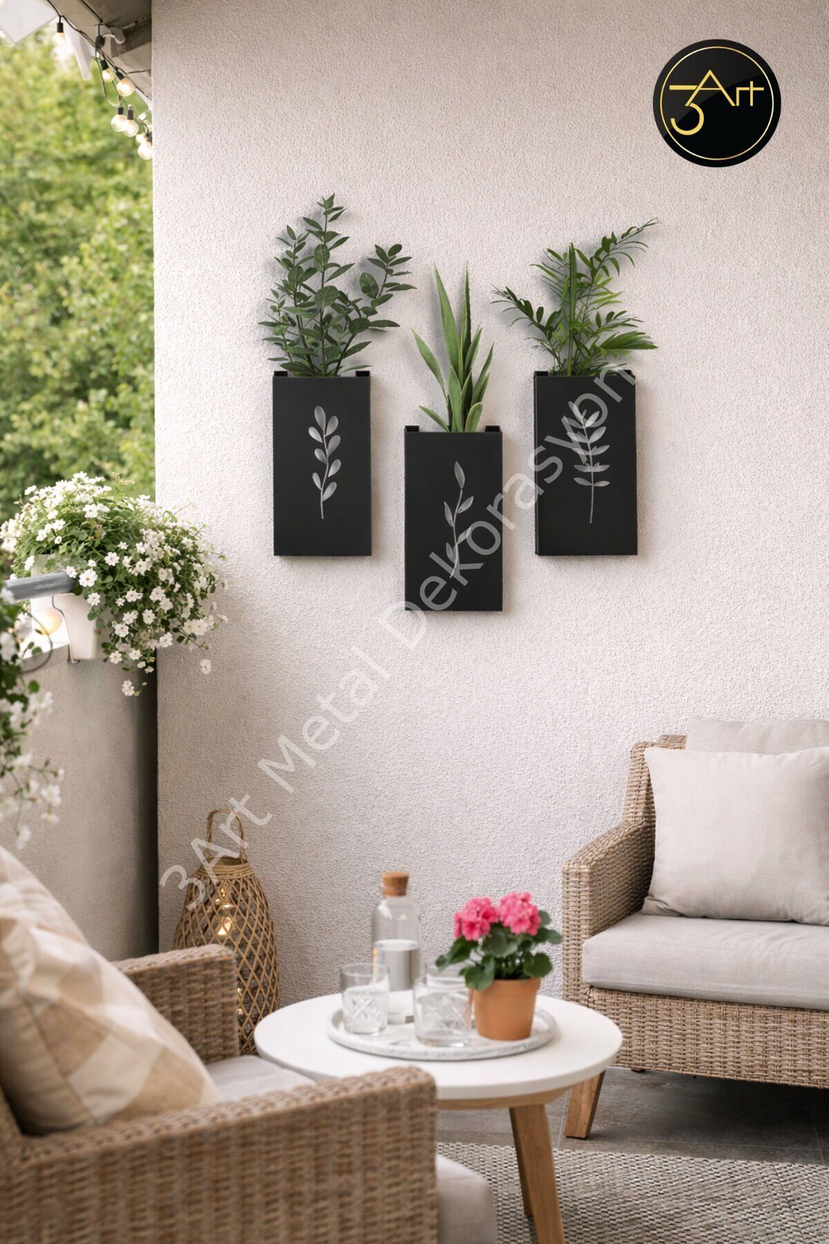 - Modern tasarımıyla dikkat çeken bu duvar saksısı, balkon, bahçe ve salon gibi alanlarda şık bir dekoratif unsur olarak kullanılabilir.; - Dayanıklı metal malzemesi sayesinde uzun ömürlü kullanım sunar ve 2-3 kg ağırlığı ile kolayca monte edilebilir.; - Siyah rengi ve dikdörtgen şekliyle her türlü iç ve dış mekana uyum sağlar, mekanınıza modern bir dokunuş katar.; - 10-15 cm genişlik ve 15-20 cm yükseklik ölçüleriyle kompakt bir tasarım sunar, dar alanlarda bile rahatlıkla kullanılabilir.; - Tek ebat seçeneğiyle pratik bir kullanım imkanı sunarken, 15-20 cm uzunluk/çapı ile ideal boyutlarda bir çözüm sağlar.; - 3'lü set içeriği sayesinde birden fazla duvar saksısını bir arada kullanarak duvar dekorasyonunuzu zenginleştirebilirsiniz.; - Nemli bir bezle kolayca temizlenebilen bu ürün, bakımını pratik ve zahmetsiz bir şekilde yapmanızı sağlar.; - Türkiye'de üretilmiş olup, 3art metal dekorasyon güvencesiyle sunulmaktadır.