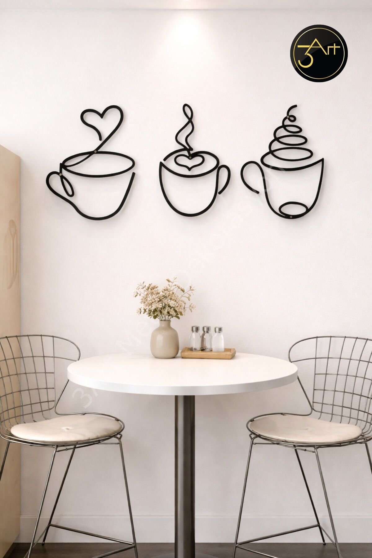 - Modern tasarımıyla mutfak ve kafe dekorasyonunuza şıklık katar.; - Türkiye'de üretilmiş olup, yerel üretim desteklenir.; - Dayanıklı metal materyal kullanımı sayesinde uzun ömürlü bir kullanım sunar.; - Üç parçadan oluşan set, duvarınızda dikkat çekici bir bütünlük sağlar.;