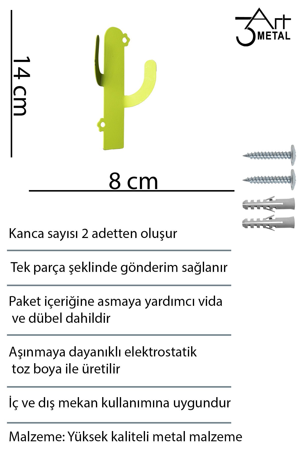 Evinizde şıklığı ve düzeni bir araya getiren 3ART METAL askılıklar ile tanışın! Tamamen mat siyah elektrostatik toz boyalı, lazer kesim teknolojisiyle üretilen bu askılıklar, hem işlevsel hem de dekoratif bir kullanım sunar.; Her bir ürün, yüksek kaliteli metal malzemeden üretilmiş olup, el işçiliği titizliğiyle montaj öncesi kontrol edilmiştir.; Modern ve minimalist tarzda tasarlanan bu metal duvar askılığı, özellikle ev girişlerinde, banyo ve yatak odalarında, çocuk odalarında ya da ofislerde hem kullanışlılık hem de estetik bir dokunuş sağlar.; Geniş kanca yapısıyla mont, çanta, havlu, bornoz, anahtar ve aksesuarlarınızı rahatlıkla taşıyabilir.; Aynı zamanda duvara kolayca monte edilebilen bu ürünler, güçlü yapısı sayesinde uzun ömürlü kullanım sağlar.; ⸻ ⭐ Neden 3ART METAL Askılık? • %100 yerli üretim • Dayanıklı ve uzun ömürlü metal yapı • Şık ve zamansız mat siyah kaplama • Lazer kesim estetiği • Her dekorasyona uyum sağlayan minimalist tasarım • Elde üretilmiş hissi veren detaylar • Kurulum için gerekli vida/dübel dahildir ⸻ metal askılık, duvar askısı, banyo askısı, mat siyah askılık, el yapımı dekoratif askılık, modern portmanto, giriş askılığı, anahtarlık, çocuk odası askısı, trendy askılık, metal ev dekorasyonu, 3art metal, lazer kesim dekoratif askıDayanıklı metal malzeme kullanımı, uzun ömürlü ve sağlam bir yapı sunar; Duvara monte edilebilir tasarımı sayesinde yerden tasarruf sağlar ve mekanınıza modern bir dokunuş katar; Kaktüs desenli tasarımıyla dekoratif bir görünüm sergiler, yaşam alanlarınıza estetik bir hava katar;