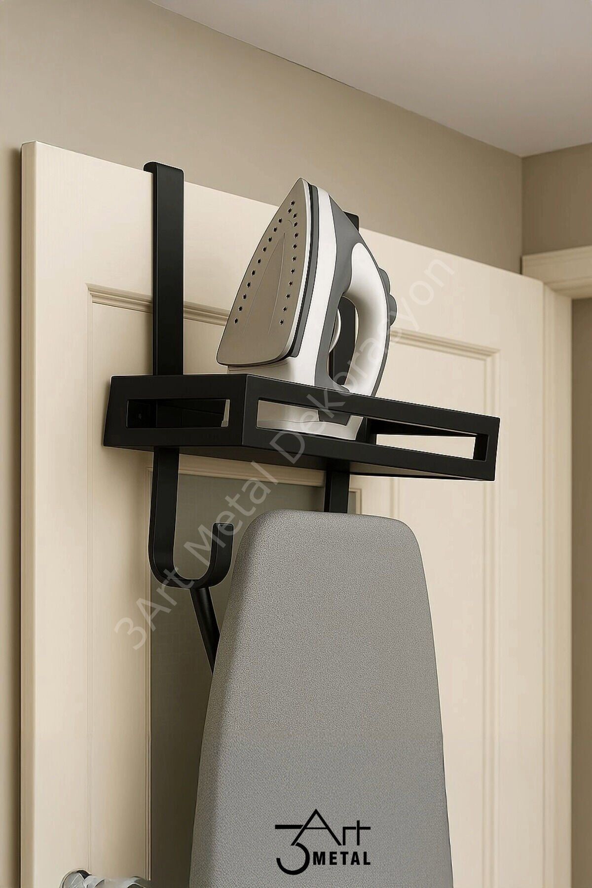 metal kapı arkası ütü ve ütü masası standı Modern tasarımı ve sağlam yapısıyla öne çıkan bu kapı arkası ütü ve ütü masası standı, evinizde yerden tasarruf etmenizi sağlar.; Mat siyah elektrostatik toz boyalı metal yapısı sayesinde uzun ömürlü ve şık bir görünüme sahiptir.; Ütünüzü üst bölümde güvenli şekilde muhafaza ederken, alt kısımdaki kancalar sayesinde ütü masanızı pratik bir şekilde asabilirsiniz.; Delme, vida gibi işlemlere gerek olmadan kapıya kolayca monte edilir.; Dar alanlar için ideal bir çözüm sunar.; Öne çıkan özellikler: •Mat siyah şık tasarım •Elektrostatik toz boyalı sağlam metal gövde •Kapıya kolayca takılır, montaj gerektirmez •Ütü ve ütü masası için özel bölmeli •Yer tasarrufu sağlar, dağınıklığı önler Kullanım alanları: Ev, çamaşır odası, otel, stüdyo daireler Uyumlu kapı kalınlığı: 2-4 cm arası Ürün ölçüsü - 35x15