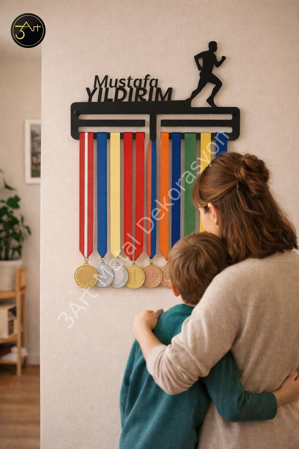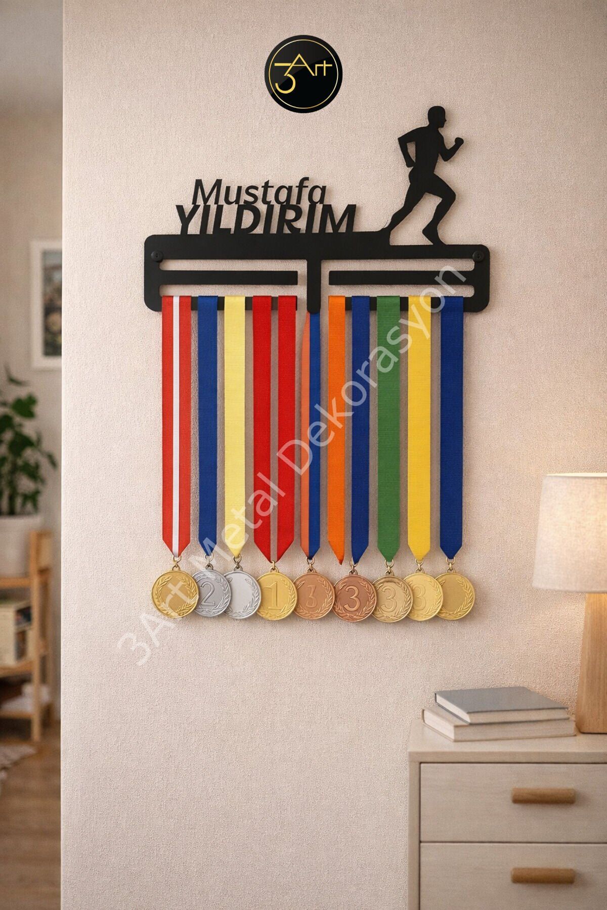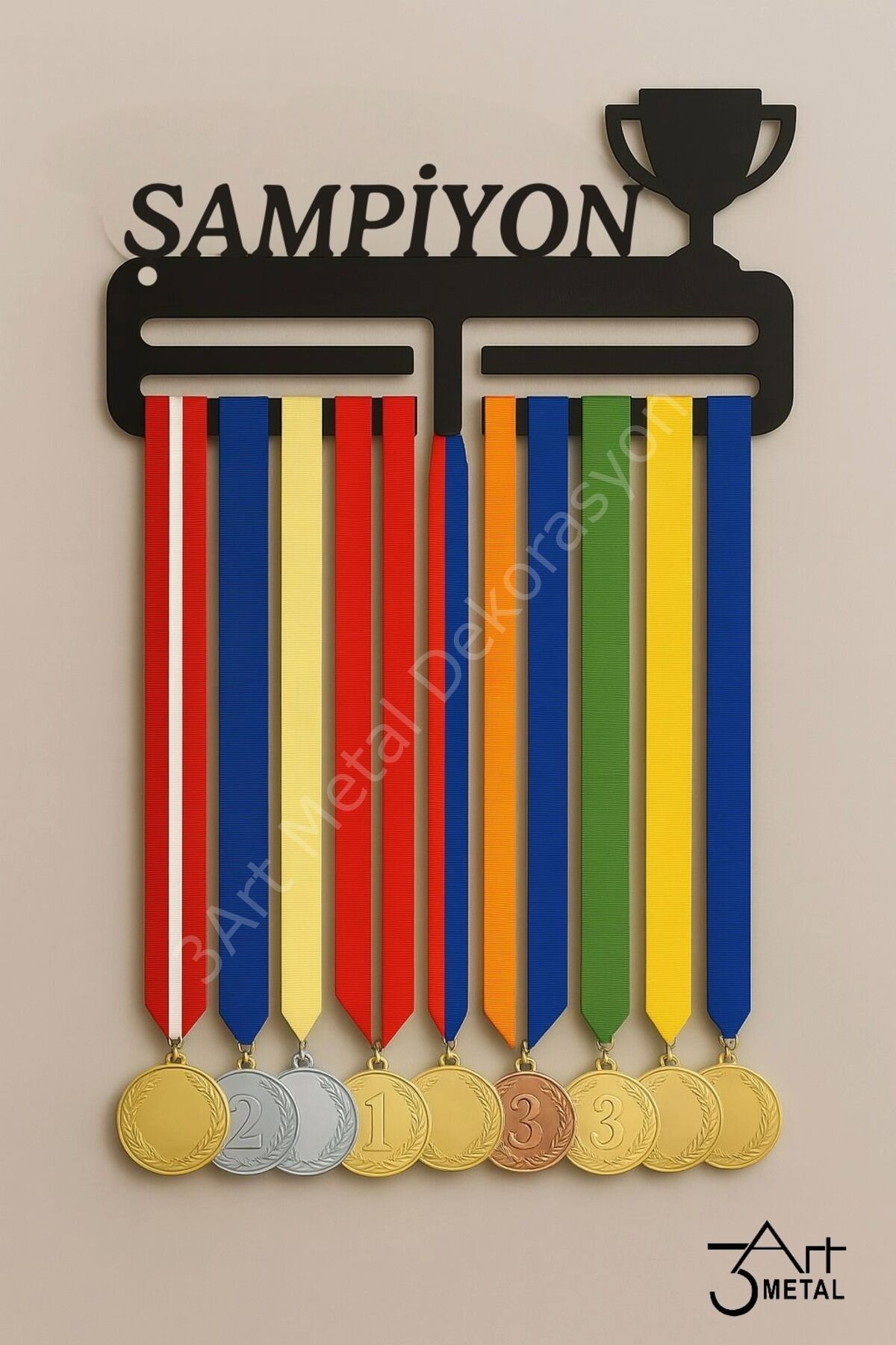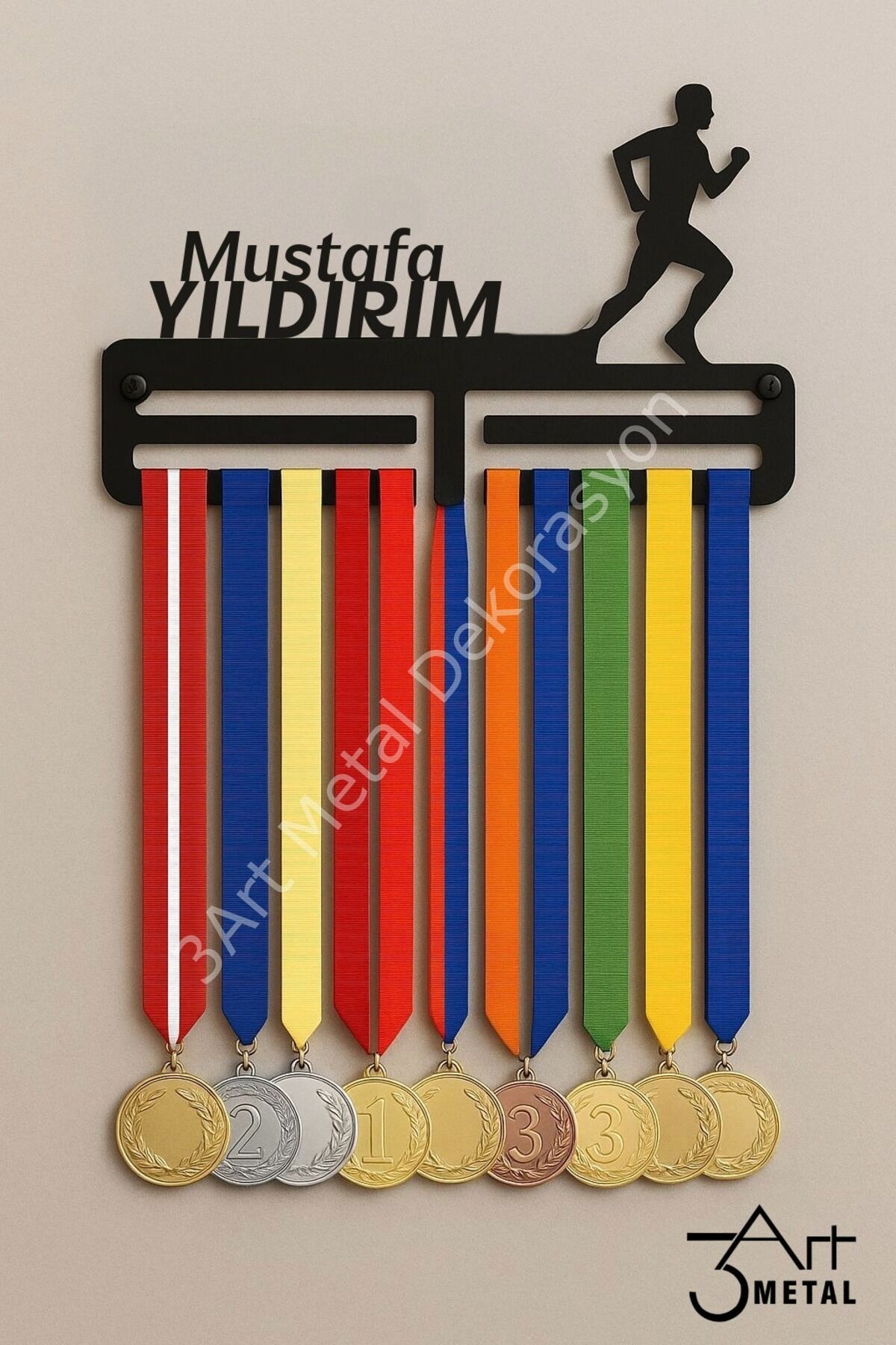 - Modern tasarımıyla sporcu madalyalarınızı şık bir şekilde sergilemenizi sağlar.; - Kişiye özel isim baskısı ile madalya askılığınızı benzersiz kılın.; - Duvara monte edilebilir yapısı sayesinde yerden tasarruf ederken, madalyalarınızı güvenli bir şekilde saklayabilirsiniz.; - Dayanıklı metal materyali ile uzun ömürlü kullanım sunar.; - Türkiye'de üretilmiştir, yerel üretimle desteklenen bir üründür.; - 30 cm genişliğe ve 6 cm yüksekliğe sahip kompakt tasarımı, her türlü duvar alanına kolayca uyum sağlar.;