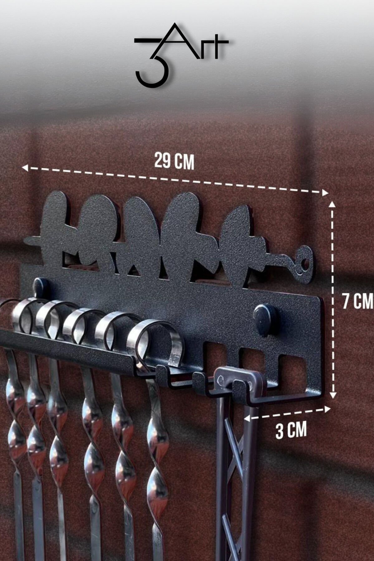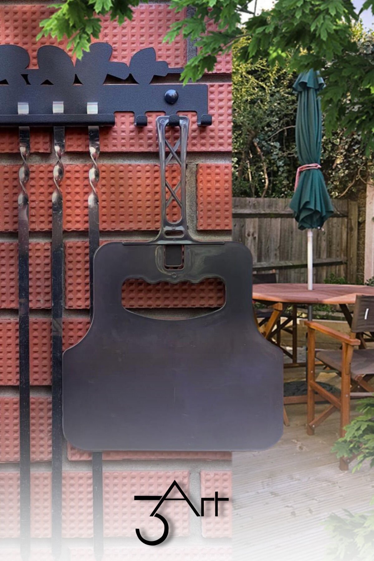 - Lazer kesim teknolojisi ile üretilen mangal askılığı, şık ve modern bir görünüm sunar.; - Duvar montajlı tasarımı sayesinde mutfak veya barbekü alanınızda yerden tasarruf sağlar.; - Siyah renk seçeneği ile her türlü dekorasyona kolayca uyum sağlar.; - 3art metal dekorasyon tarafından üretilen bu ürün, kalite ve dayanıklılık açısından güven verir.; - CE uygunluk sembolü ile Avrupa standartlarına uygun olarak üretilmiştir, güvenle kullanabilirsiniz.; - Dikdörtgen formu, şiş ve ızgara aparatlarının düzenli bir şekilde saklanmasına olanak tanır.; - Tamir edilemez yapısı sayesinde uzun ömürlü kullanım vaat eder.