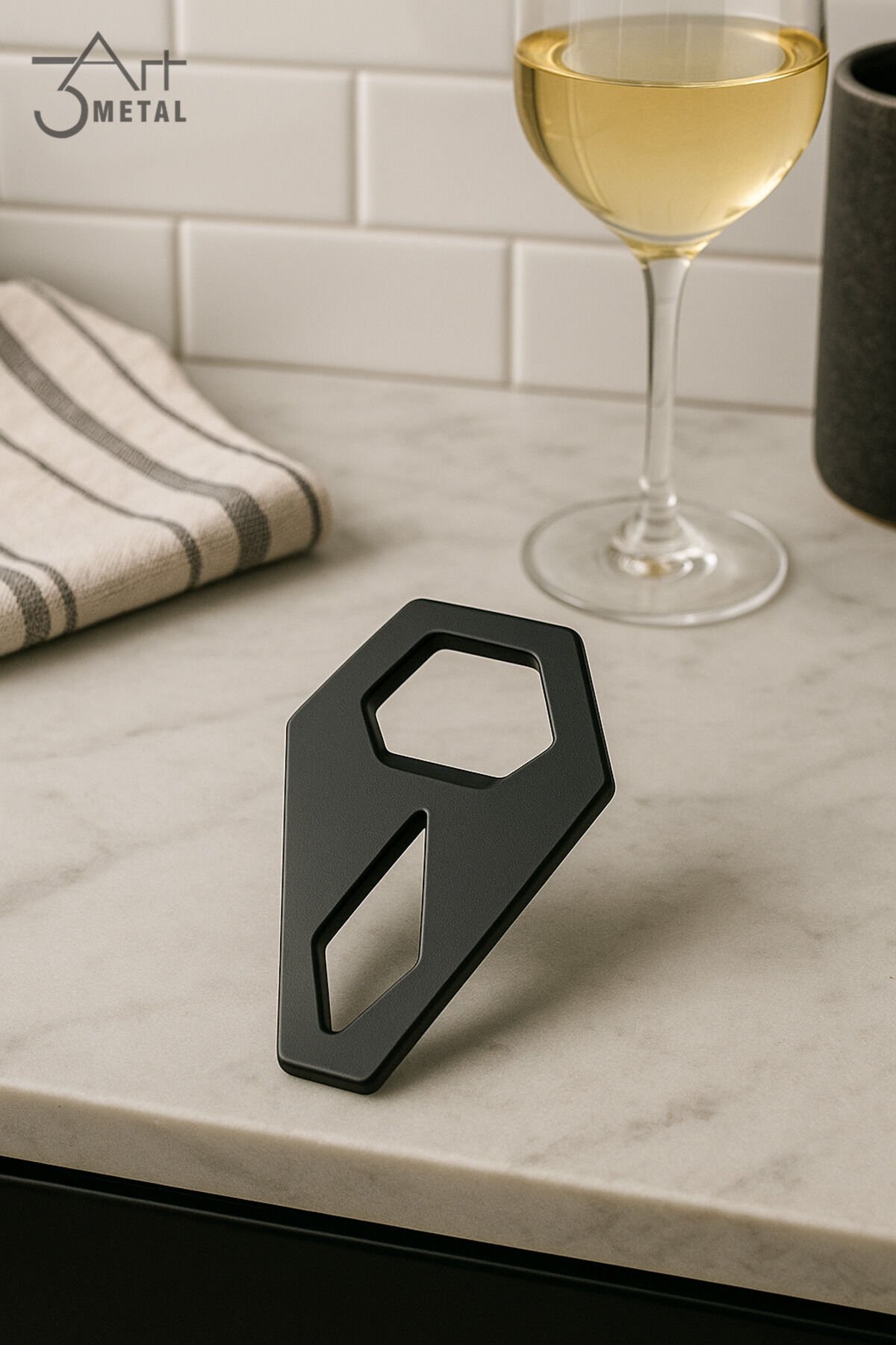 - Modern geometrik tasarımı ile mutfaklarınıza şıklık katan mat siyah gazoz açacağı.; - Ergonomik yapısı sayesinde kullanım kolaylığı sunar ve günlük işlerinizde size eşlik eder.; - Dayanıklı çelik malzemesi uzun ömürlü kullanım vaat ederken, paslanmaya karşı dirençlidir.; - Üreticinin güvenilirliğiyle üretilmiş olup, kalite standartlarına uygun olarak tasarlanmıştır.; - Yıkanabilir özelliği sayesinde temizliği pratik ve zahmetsizdir; böylece hijyenik bir kullanım sağlar.; - 3Art Metal Dekorasyon tarafından ithal edilmiş olup, Türkiye'de yetkili temsilcisi olarak hizmet vermektedir.; - Web renk seçeneği olarak siyah tonuyla her türlü mutfak dekorasyonuna uyum sağlar.; - Kullanım talimatları arasında nemli bir bezle silme işlemi yer alır; bu şekilde ürününüz ilk günkü gibi kalacaktır.