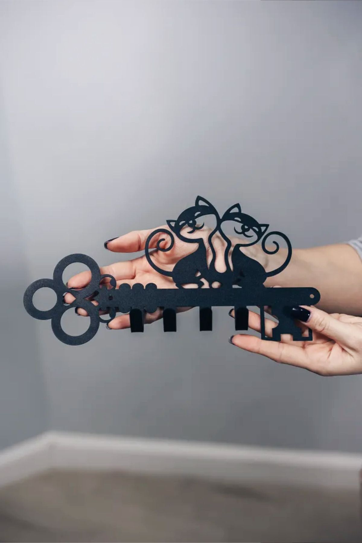 - 30 cm genişliğindeki metal anahtar askılığı, evinizin veya ofisinizin dekorasyonuna şık bir dokunuş ekler.; - Dayanıklı metal malzemesi ile uzun ömürlü kullanım sunar ve kedi deseniyle modern bir görünüm kazandırır.; - Duvara monte edilebilir yapısı sayesinde kolayca yerleştirilebilir ve pratik bir saklama çözümü sağlar.; - 18 cm yüksekliği ile ideal boyutlarda tasarlanmıştır; hem küçük hem de büyük anahtarlarınız için uygun alan sunar.; - Modern stil sahibi olan bu anahtarlık, her türlü iç mekan tasarımına uyum sağlayacak şekilde dizayn edilmiştir.; - Yetişkin kullanıcıların ihtiyaçlarına yönelik olarak üretilmiş olup, günlük eşyalarınız için güvenle kullanabilirsiniz.; - Siyah renkteki web rengi ile zamansız bir estetik sergilerken, modern tema/stiliyle dikkat çeker.