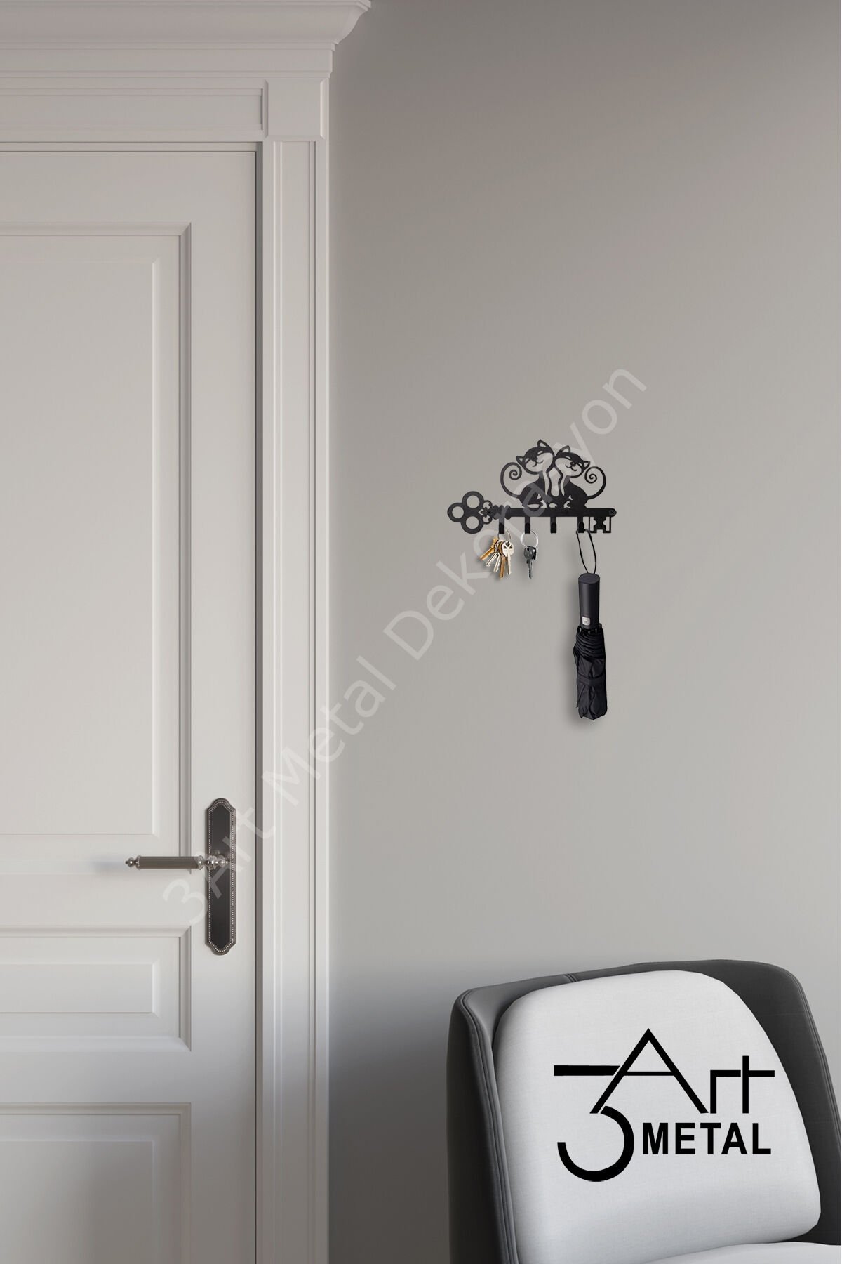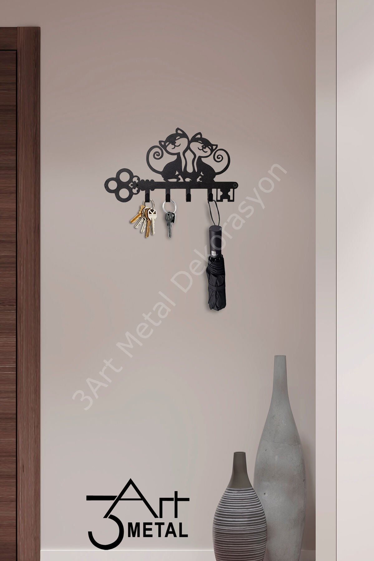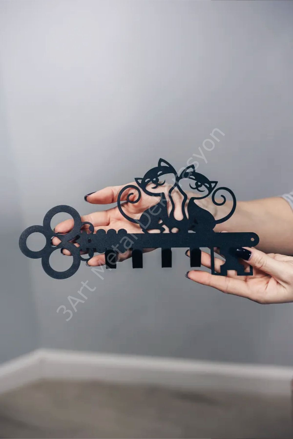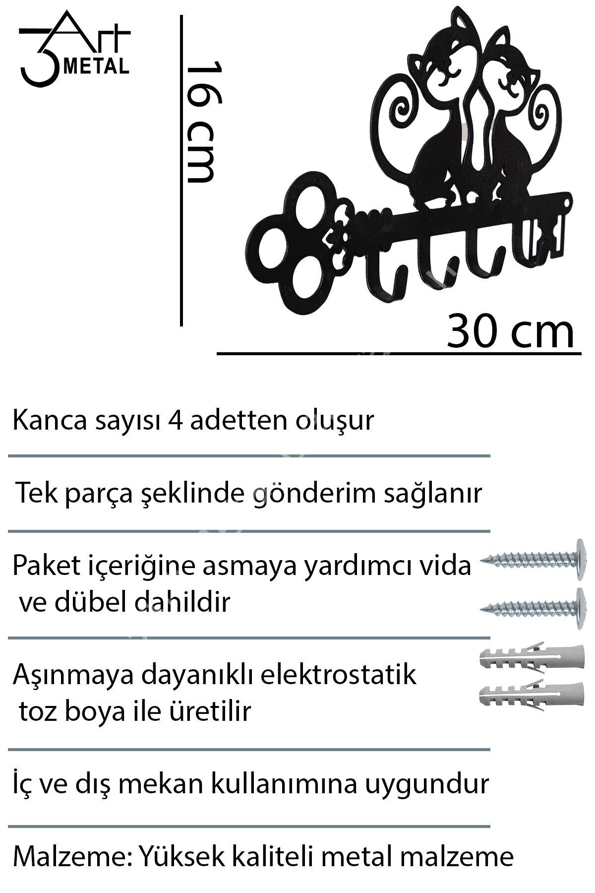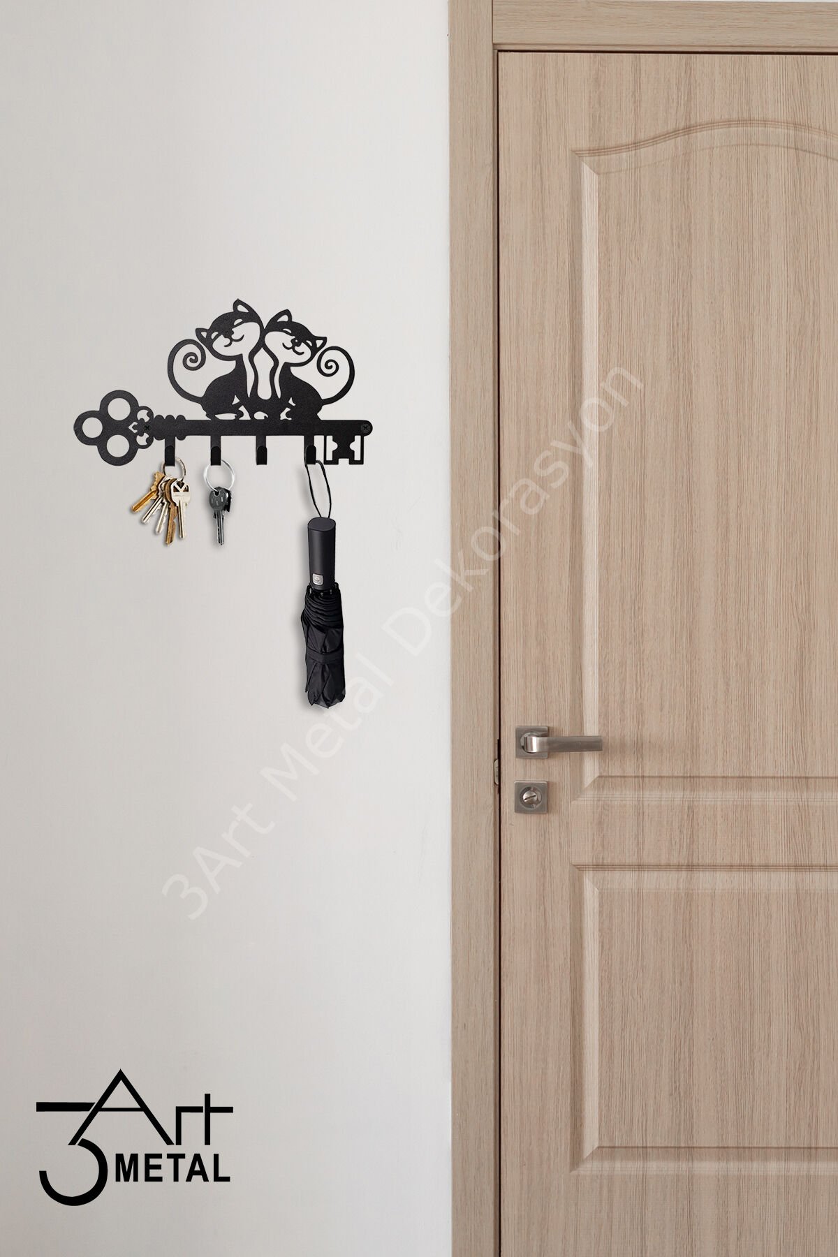 - 30 cm genişliğindeki metal anahtar askılığı, evinizin veya ofisinizin dekorasyonuna şık bir dokunuş ekler.; - Dayanıklı metal malzemesi ile uzun ömürlü kullanım sunar ve kedi deseniyle modern bir görünüm kazandırır.; - Duvara monte edilebilir yapısı sayesinde kolayca yerleştirilebilir ve pratik bir saklama çözümü sağlar.; - 18 cm yüksekliği ile ideal boyutlarda tasarlanmıştır; hem küçük hem de büyük anahtarlarınız için uygun alan sunar.; - Modern stil sahibi olan bu anahtarlık, her türlü iç mekan tasarımına uyum sağlayacak şekilde dizayn edilmiştir.; - Yetişkin kullanıcıların ihtiyaçlarına yönelik olarak üretilmiş olup, günlük eşyalarınız için güvenle kullanabilirsiniz.; - Siyah renkteki web rengi ile zamansız bir estetik sergilerken, modern tema/stiliyle dikkat çeker.