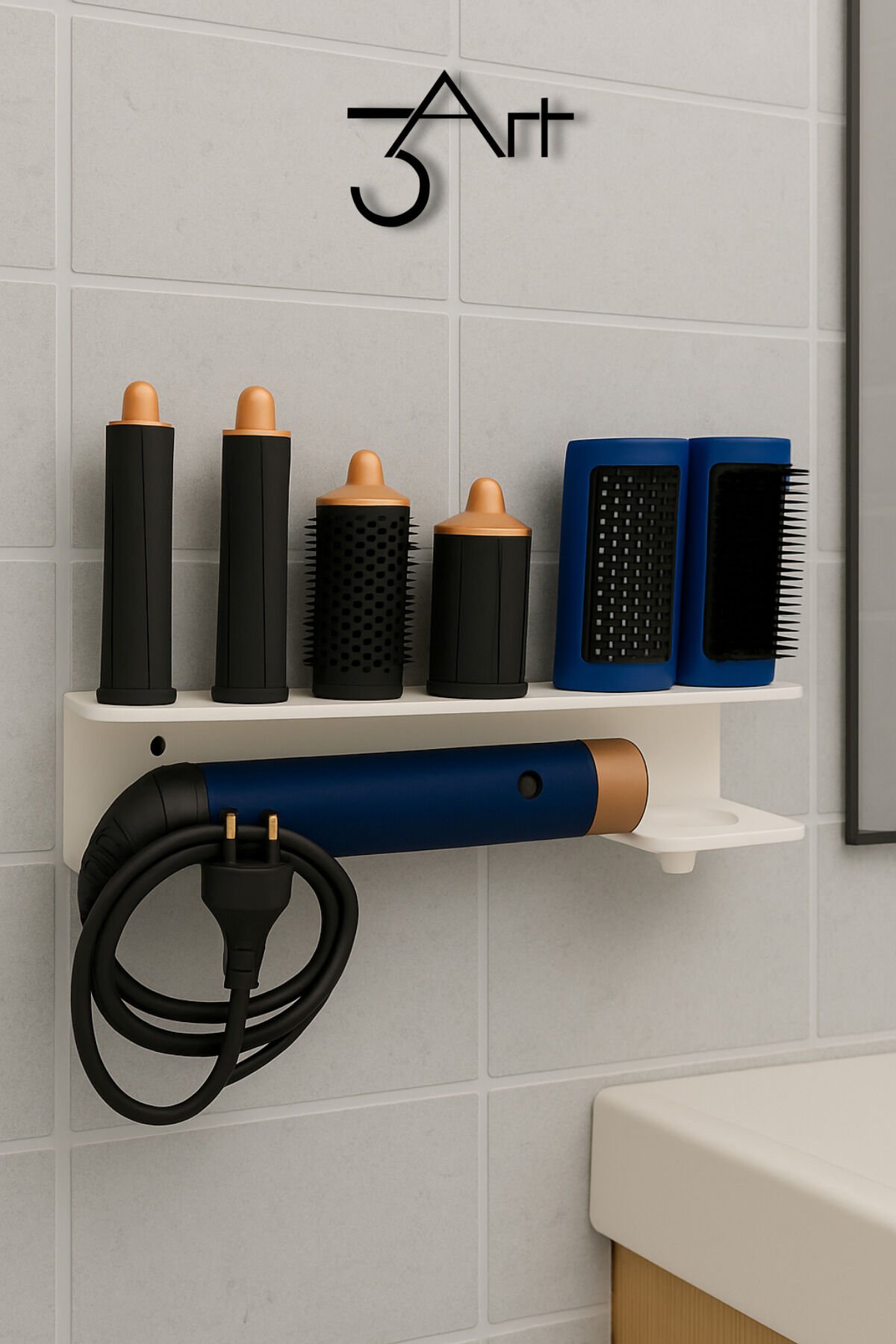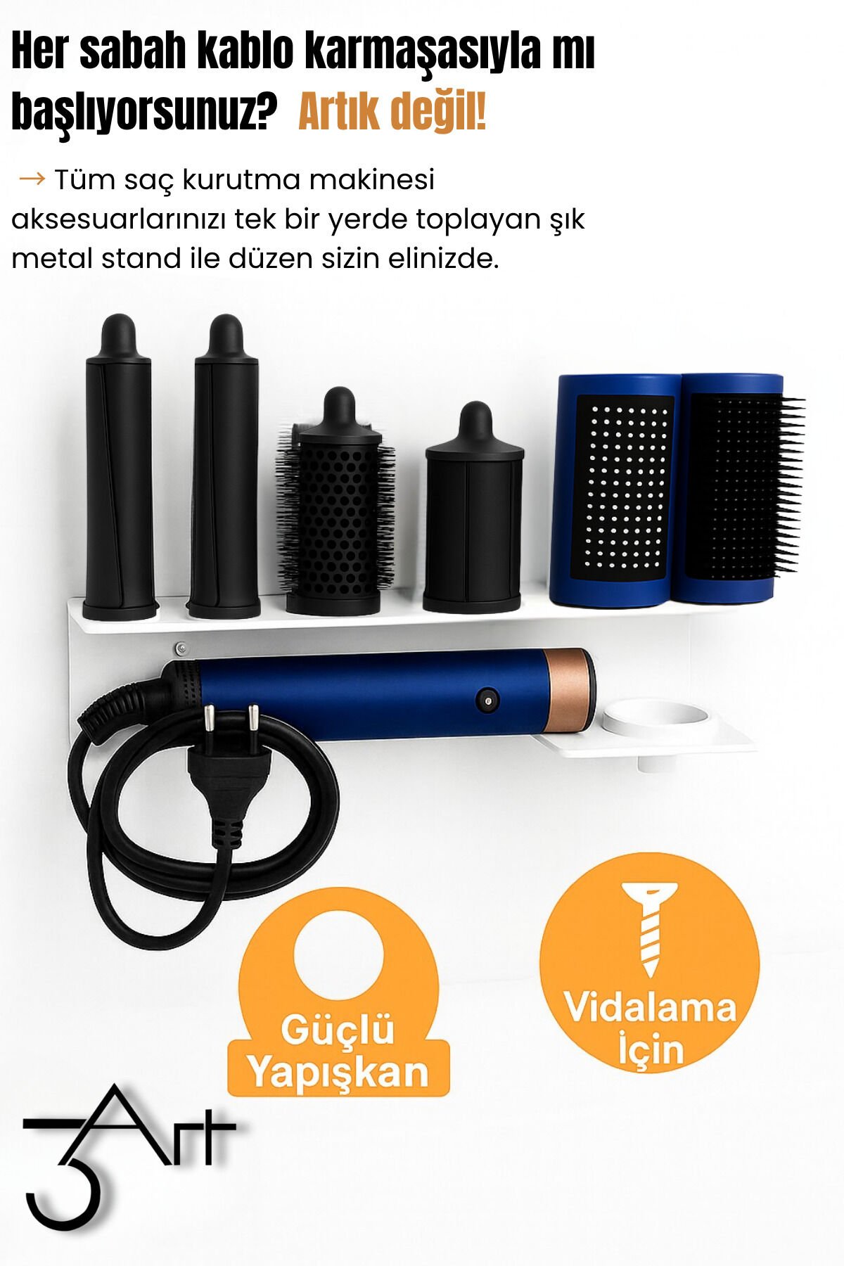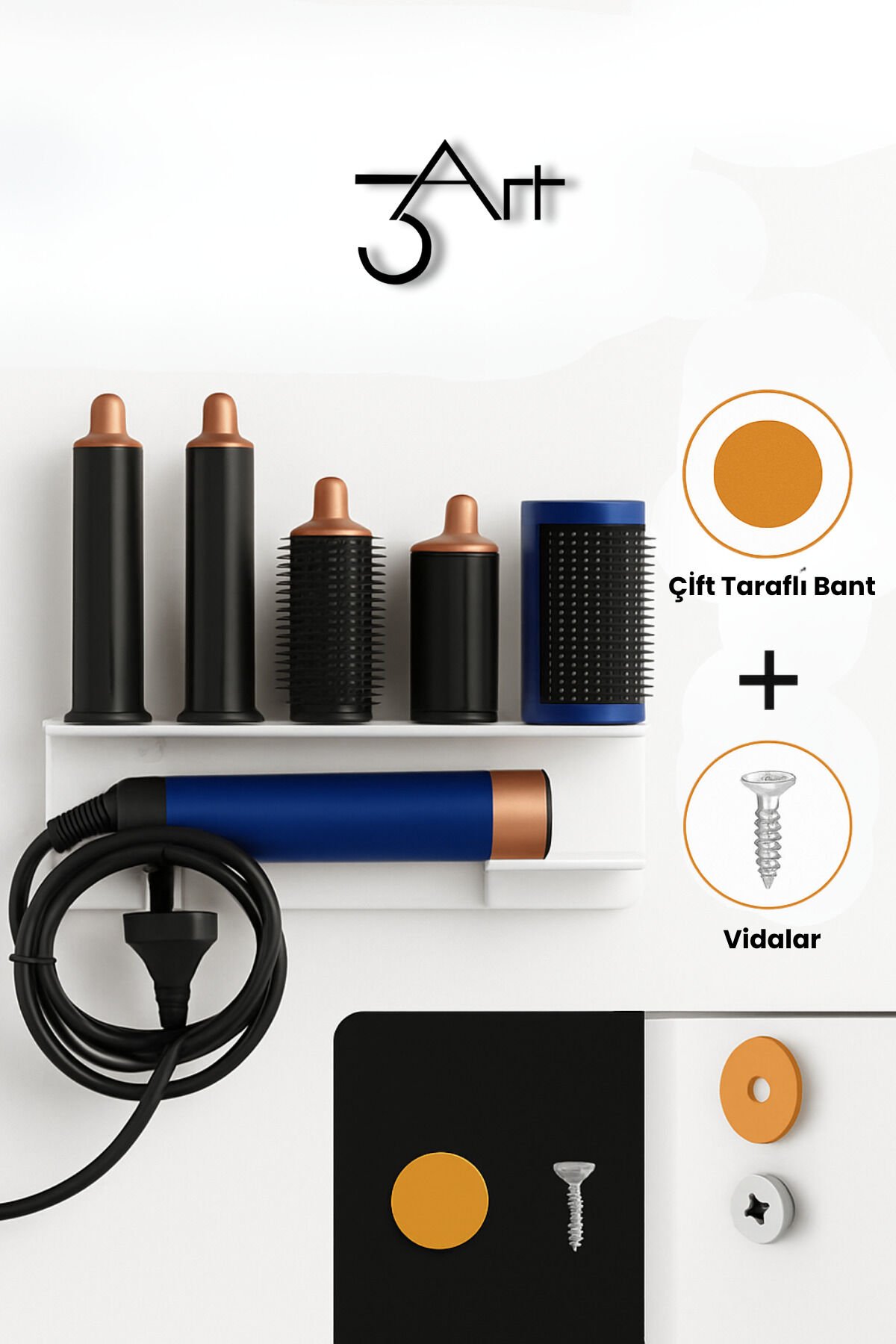- Metal DysonAirwrap Standı, saç şekillendiricilerinizi düzenli ve şık bir şekilde saklamanızı sağlar.; - Dayanıklı yapısı ile uzun ömürlü kullanım sunar ve saç kurutma makinenizi güvenle tutar.; - Beyaz renk seçeneğiyle modern ve zarif bir görünüm kazandırır, dekorasyonunuza kolayca uyum sağlar.; - Manyetik başlık organizeri, saç şekillendiricilerinizin başlıklarını düzenli bir şekilde saklamanızı kolaylaştırır.; - Nemli bir bezle silinebilir olması sayesinde temizliği pratiktir ve hijyenik kullanım imkanı sunar.; - TR menşeili olup, 3art metal dekorasyon tarafından üretilmiştir; yerel üretimle kaliteyi yakından tanıyın.; - Saç kurutma makinesi askısı olarak tasarlanmıştır; böylece saç şekillendiricilerinizi kolayca asabilir ve yer kaplamadan saklayabilirsiniz.; - Kullanım talimatları ve uyarıları ile doğru kullanım için gerekli bilgileri içerir, böylece ürününüzü en iyi şekilde kullanabilirsiniz.; - Metal DysonAirwrap Standı, şıklık ve fonksiyonelliği bir arada sunarak banyo veya makyaj masanızda vazgeçilmez bir aksesuar haline gelir.; Ürün ölçüsü - 33x10