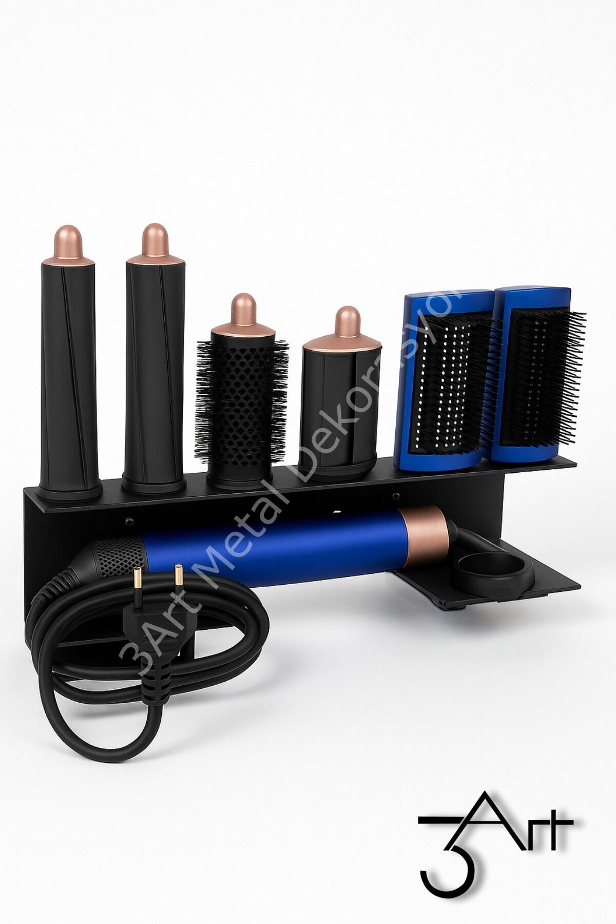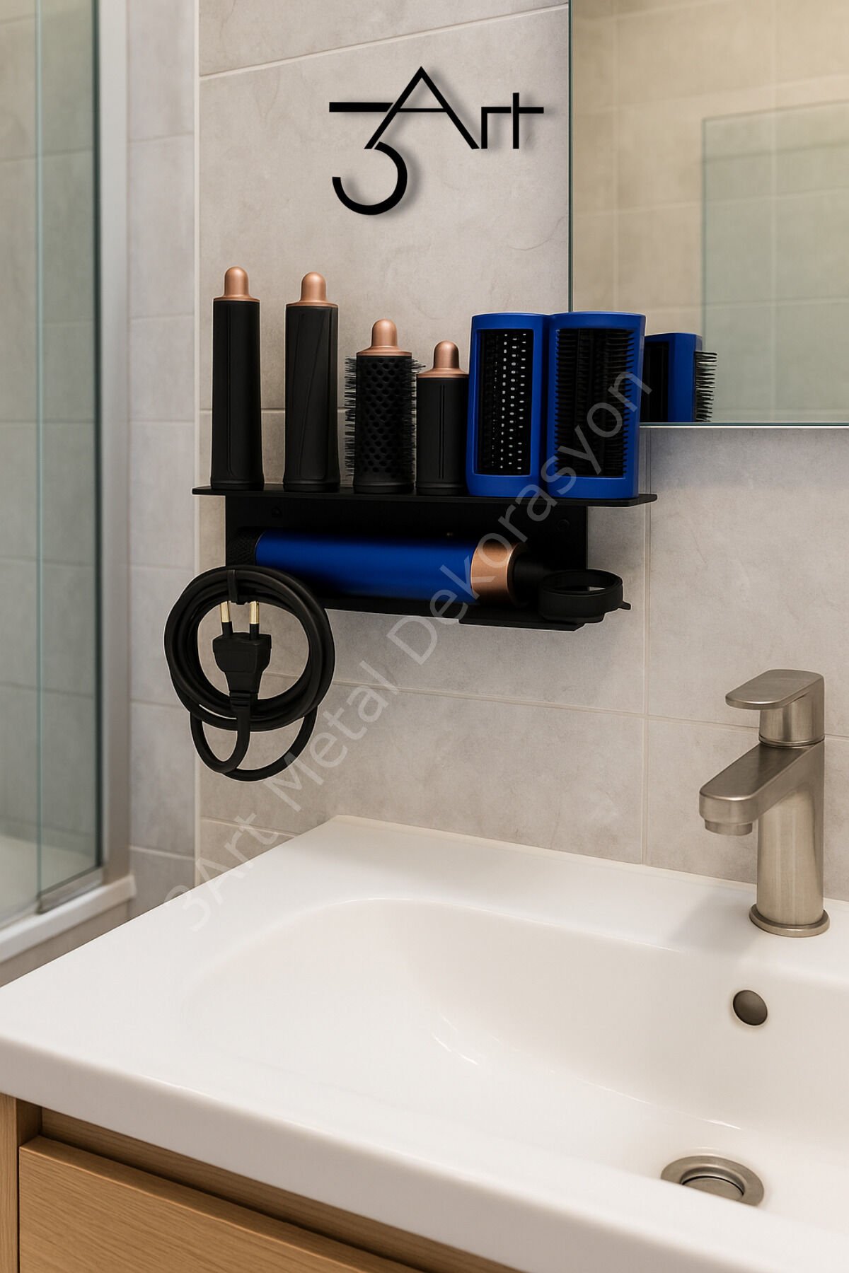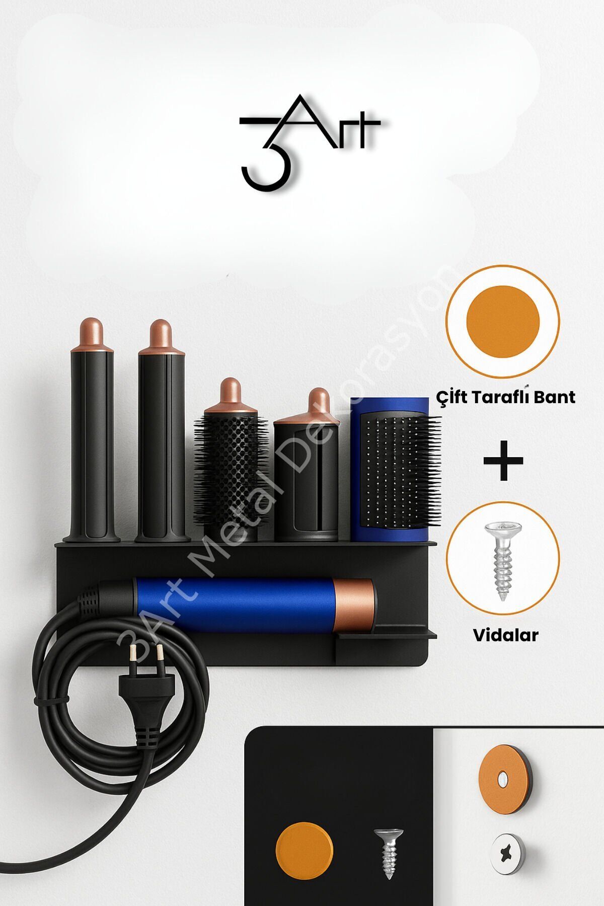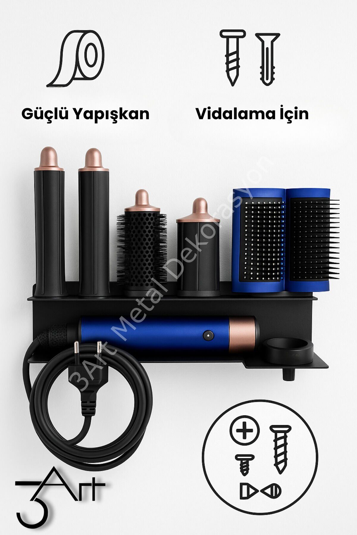 - Şık ve dayanıklı tasarımı ile metal DysonAirwrap Standı, saç şekillendirici tutucunuzu düzenli ve kolay erişilebilir tutar.; - Manyetik başlık organizeri sayesinde saç şekillendirici başlıklarınızı güvenle saklayabilir ve istediğiniz zaman kolayca erişebilirsiniz.; - Ürün, TR menşeli olup, 3art metal dekorasyon tarafından üretilmiştir; bu da yerel üretim kalitesini ve güvenilirliğini garanti eder.; - Nemli bir bezle kolayca temizlenebilir yapısı sayesinde hijyenik kullanım sağlar; böylece saç şekillendiricinizin temiz kalmasını sağlar.; - Siyah renk seçeneğiyle modern ve şık bir görünüm sunar; banyonuzda veya makyaj masanızda estetik bir dokunuş katmak için idealdir.; - Saç Kurutma Makinesi Askısı olarak tasarlanmıştır, böylece DysonAirwrap'inizi güvenle asarak saklayabilir ve yer kaplamadan düzenli tutabilirsiniz.; - Üretici bilgisi olarak 3art metal dekorasyon, ürünün kalitesinden ve dayanıklılığından emin olmanız için güvenilir bir referanstır.; - Kullanım talimatları ve uyarıları ile birlikte gelen bu ürün, kullanıcı dostu bir deneyim sunarak güvenli ve pratik kullanım vaat eder.; Ürün ölçüsü - 33x10