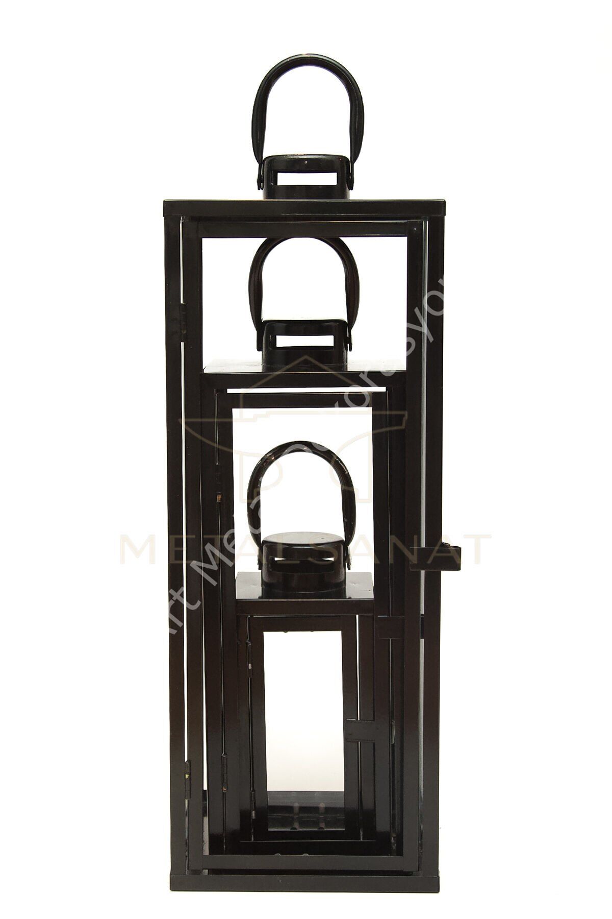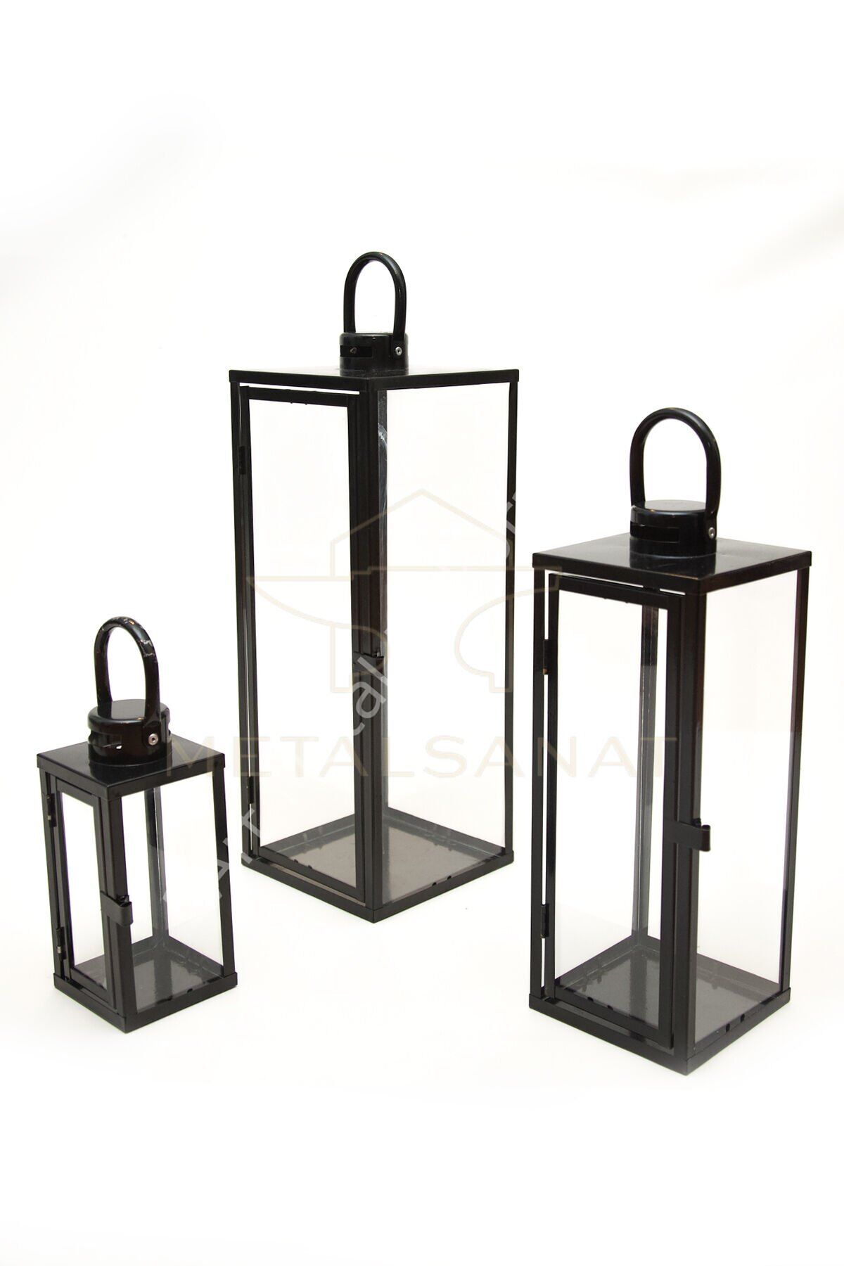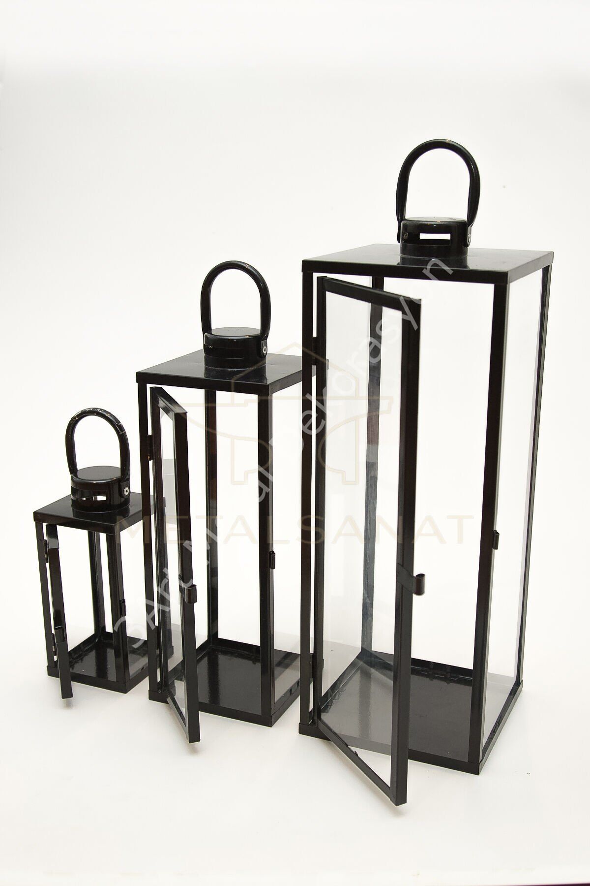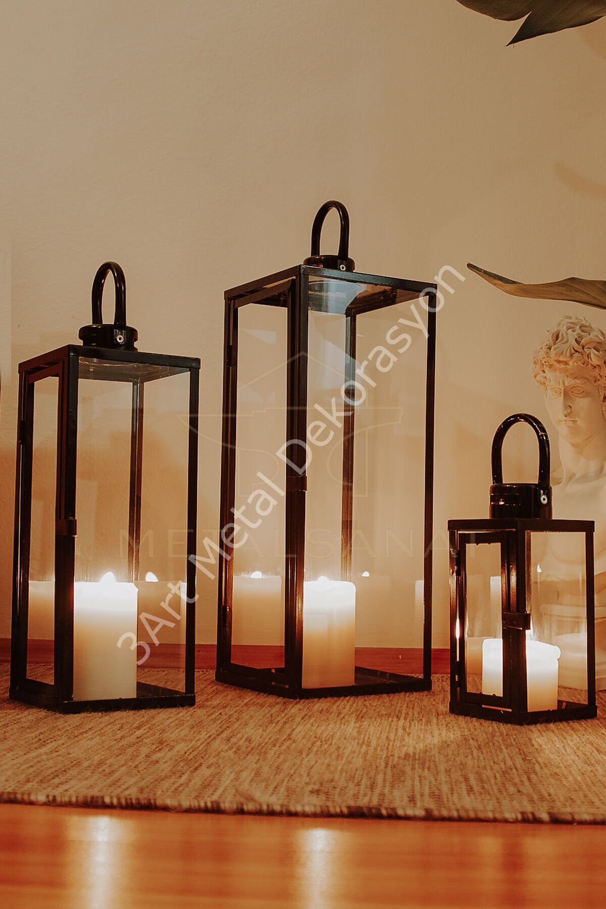 MALZEME : Metal / Cam ; BOYA : Elektrostatik Fırın Toz Boya ; BOYUTLAR : ; Büyük : 46cm x 18cm x 18cm ; Orta : 34cm x 14cm x 14cm ; Küçük : 19cm x 10cm x 10cm ; *ÇOK YÖNLÜ TASARIM* Bu fener seti farklı boyutlarda üç fener içerir. Farklı boyutlardaki bu fenerler herhangi bir yüzeye yerleştirilebilir veya dekoratif halkalarla asılabilir. Çeşitli tarzlara uygundur: Çiftlik evinden modern alanınıza, düğün ve doğum gününden günlük hayata gibi hayal gücünüz ile sınırsızdır. G iriş geçidi, tv ünitesi ya da şömine yanı, masa dekorasyonu, veranda, sundurma ve daha birçok iç ve dış mekan için çeşitli stiller dekor etmenizi sağlar. Bu fener en sevdiğiniz kokulu, tealight veya LED mumunuzu (dahil DEĞİLDİR) sergilemek için doğru bir tercihtir. ; *KULLANIŞLI DETAYLANDIRMA* Fener, sıradan malzemelerden daha güçlü olan metal ve dört adet camdan yapılmıştır. Ürünün üst kısmında içindeki havayı sirküle edebilen bir havalandırma deliği bulunmaktadır ve yan taraftaki küçük kapı kolayca açılıp kapatılabilmektedir. ; *BAKIM KOLAYLIĞI*Fenerlerimizin bakımı kolaydır ve kalıcı bir mobilya aksesuarıdır. Temizlemek istediğinizde yumuşak bir bezle silin. Sert kimyasallar veya aşındırıcılar kullanmayın. Mumlarla kullanıldığında kolay temizlik için yanlardan güvenli bir mesafe bırakın ve fenerin ömrünü uzatın. ; *KORUNAKLI AMBALAJ* Bu fener, kargo sürecinde zarar görmeden sizlere sağlam ve eksiksiz ulaşabilmesi için MDF( sıkıştırılmış ahşap panel ) ile desteklenip kutu ile paketlenmektedir. ;