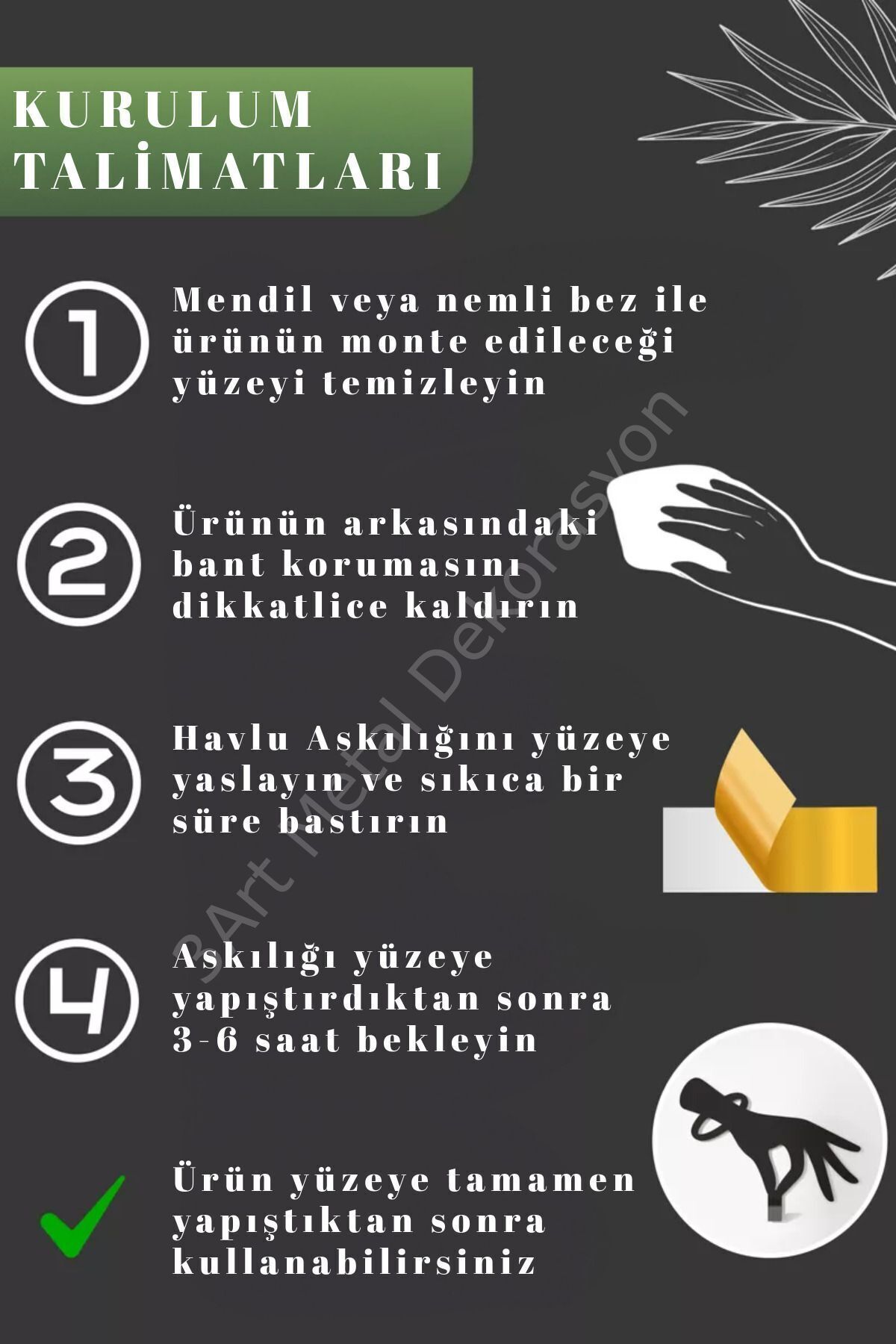Kendinden yapışkanlı dekoratif duvar askısı 3artmetal ile mutfakta, banyoda, çocuk odasında veya girişte orijinal bir dekoratif öğe olacaktır.; Kendinden yapışkanlı duvar askıları, giysi, havlu, bornoz askısı, anahtarlık, şemsiye, çocuk askısı olarak kullanılabilir.; Dekoratif duvar askıları metalden yapılmıştır ve toz boya ile boyanmıştır.; Askıya zaten profesyonel montaj bandı yapıştırılmıştır, yüzeyi sadece silmek yeterlidir.; Kolayca monte edilebilir, duvarları delmek veya mekanik bağlantı kullanmak gerekmez.; Fayans, MDF, plastik, boyalı duvarlar, metal, cam, aynalar, işlenmiş ahşap gibi yüzeylere monte etmek için uygundur.; Banyo ve tuvalet için, anahtar saklama, duvara monte edilebilir askılık, banyo ve tuvalet takımı, giriş için loft, mutfak için duvara monte edilebilir askılar, kendinden yapışkanlı askılar, duvara perde tutucular, banyo için duvar organizeri gibi çeşitli kullanım alanlarına sahiptir.; ; Malzeme: Yüksek kaliteli paslanmaz demir profil ; Ölçüler: Genişlik 13 cm, yükseklik 13 cm, derinlik: 2 cm ; Duvara ürün ile birlikte gönderilen çift taraflı bant ile monte edilmektedir.; ; Kanca sayısı 1 adetten oluşmaktadır.; ; Aşınmaya dayanıklı elektrostatik toz boya ile üretilir.; ; Detaylara ve hassas kaynaklara büyük özen gösterilerek yapılmıştır.; ; Tek parça şeklinde gönderim sağlanır.; ; Paket içeriğine asmaya yardımcı vida ve dübel dahildir.