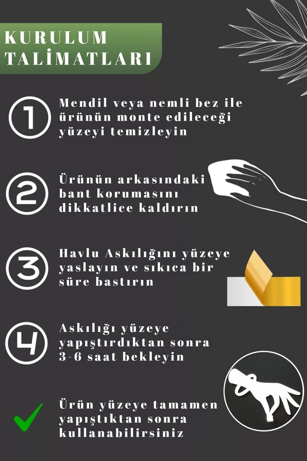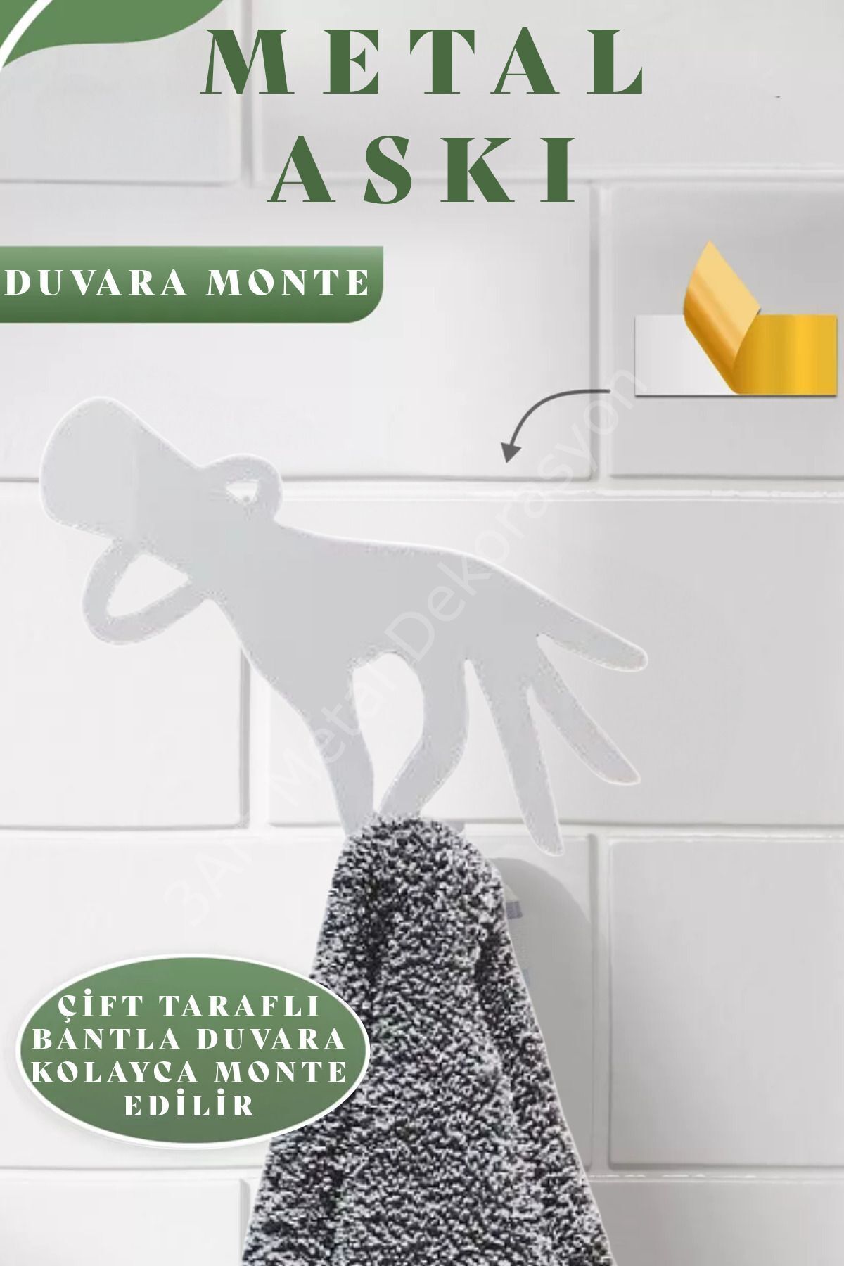 Kendinden yapışkanlı dekoratif duvar askısı 3artmetal ile mutfakta, banyoda, çocuk odasında veya girişte orijinal bir dekoratif öğe olacaktır.; Kendinden yapışkanlı duvar askıları, giysi, havlu, bornoz askısı, anahtarlık, şemsiye, çocuk askısı olarak kullanılabilir.; Dekoratif duvar askıları metalden yapılmıştır ve toz boya ile boyanmıştır.; Askıya zaten profesyonel montaj bandı yapıştırılmıştır, yüzeyi sadece silmek yeterlidir.; Kolayca monte edilebilir, duvarları delmek veya mekanik bağlantı kullanmak gerekmez.; Fayans, MDF, plastik, boyalı duvarlar, metal, cam, aynalar, işlenmiş ahşap gibi yüzeylere monte etmek için uygundur.; Banyo ve tuvalet için, anahtar saklama, duvara monte edilebilir askılık, banyo ve tuvalet takımı, giriş için loft, mutfak için duvara monte edilebilir askılar, kendinden yapışkanlı askılar, duvara perde tutucular, banyo için duvar organizeri gibi çeşitli kullanım alanlarına sahiptir.; ; Malzeme: Yüksek kaliteli paslanmaz demir profil ; Ölçüler: Genişlik 13 cm, yükseklik 13 cm, derinlik: 2 cm ; Duvara ürün ile birlikte gönderilen çift taraflı bant ile monte edilmektedir.; ; Kanca sayısı 1 adetten oluşmaktadır.; ; Aşınmaya dayanıklı elektrostatik toz boya ile üretilir.; ; Detaylara ve hassas kaynaklara büyük özen gösterilerek yapılmıştır.; ; Tek parça şeklinde gönderim sağlanır.; ; Paket içeriğine asmaya yardımcı vida ve dübel dahildir.