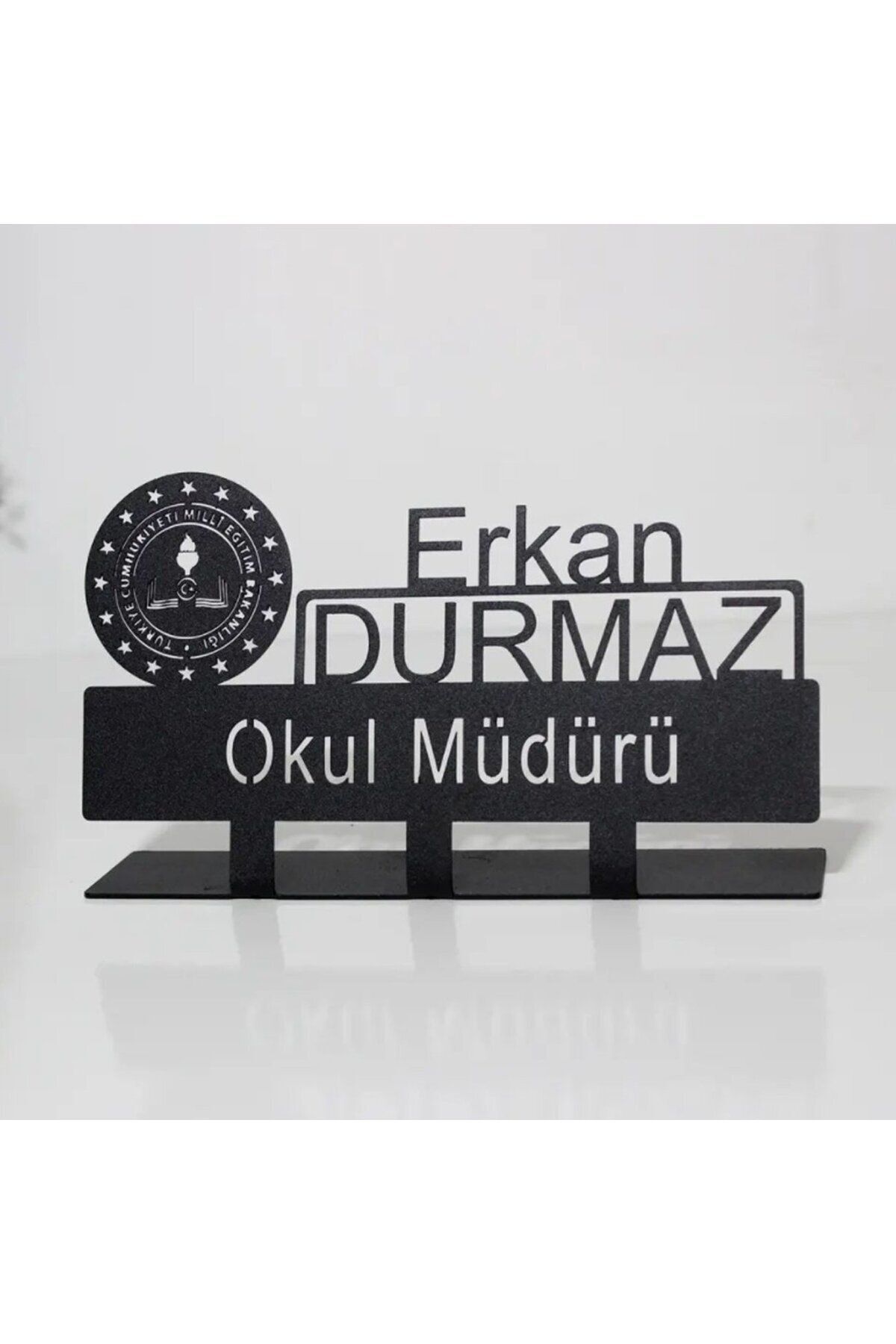 - Şık ve profesyonel görünümüyle dikkat çeken siyah renkli masaüstü isimlik, ofisinizin estetiğini tamamlar.; - Kişiselleştirilebilir tasarımı sayesinde, okul müdürü veya diğer yöneticilere özel olarak hazırlanır ve onların ismine göre özelleştirilebilir.; - 20 x 20 cm boyutlarındaki bu metal isimlik, hem küçük hem de büyük masalara kolayca uyum sağlar ve yer kaplamaz.; - Tek ebat seçeneği ile standart masa ölçülerine mükemmel şekilde oturur ve kullanım kolaylığı sunar.