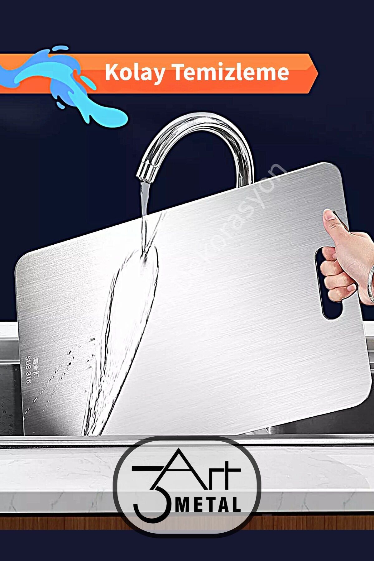 - Paslanmaz çelik malzemesi sayesinde uzun ömürlü kullanım sunar ve mutfakta hijyenik bir ortam sağlar.; - 34x24 cm boyutlarındaki kesim tahtası, geniş yüzey alanı ile çeşitli yiyeceklerinizi rahatlıkla dilimlemenize olanak tanır.; - Modern ve şık bir görünüm sergilerken, mutfak dekorasyonunuza kolayca uyum sağlar.; - Bulaşık makinesinde yıkanabilme özelliği ile pratik temizlik imkanı sunarak zaman kazandırır ve hijyenik kalmasını sağlar.; -Üreticinin 3art metal dekorasyon olması, kalite standartlarına uygun üretim ve müşteri memnuniyetine odaklandığını gösterir.; Mutfakta hem hijyen hem de dayanıklılık arayanlar için tasarlandı! Paslanmaz çelik metal doğrama tahtası, kesme, doğrama ve hazırlık işlemlerinizde maksimum konfor sunar.; Ahşap ve plastik tahtalara göre bakteri tutmaz, kolay temizlenir ve uzun ömürlüdür.; ✅ Paslanmaz çelik gövde: Hijyenik ve modern tasarım