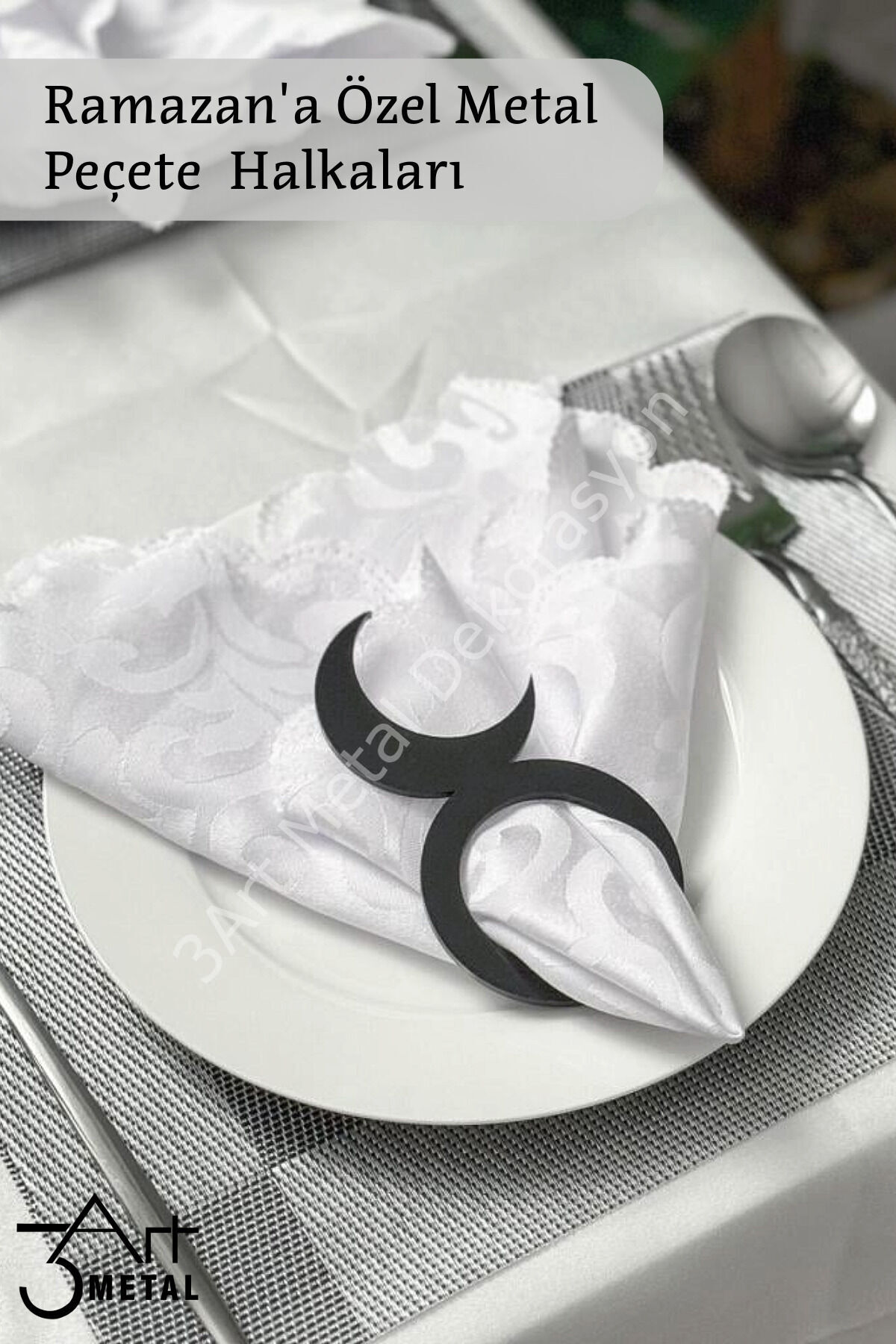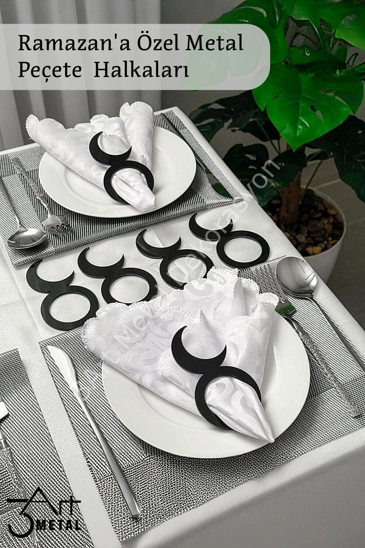 - Ramazan ayına özel tasarımıyla, siyah renkteki metal peçete yüzükleri, sofralarınıza şıklık katıyor.; - Zarif ve lüks görünümüyle dikkat çeken bu set, 6 adet Hilal desenli metal peçete halkasından oluşuyor.; - Dayanıklı metal materyali sayesinde uzun süreli kullanım imkanı sunarken, kolay temizlenebilirliği ile pratiklik sağlıyor.; - Standart boyutlarındaki 10 x 10 cm ebatlarıyla ideal boyutta olan bu peçete halkaları, her türlü masa düzenine uyum sağlıyor.; - Türkiye'de üretilmiş olup yerel kaynaklardan elde edilen malzemelerle kalite standartlarına uygun olarak üretilmiştir.; - Bakım talimatlarına göre nemli bir bezle silerek temizlenmesi önerilir; böylece hijyenik ve parlak kalmasını sağlayabilirsiniz.; - tarafından garantili olarak tedarik edilen bu ürünler, güvenle satın alabileceğiniz birinci sınıf hizmet sunar.; Ramazan ve iftar sofralarınıza şıklık katacak metal peçete halkaları! Lazer kesim tasarımı ve dayanıklı metal yapısıyla sofranıza modern ve zarif bir dokunuş ekler.; Hilal motifli bu peçete yüzükleri, özel davetler, iftar sofraları ve Ramazan akşamları için mükemmel bir tamamlayıcıdır.; ✅ Şık ve estetik tasarım ✅ Dayanıklı metal malzeme ✅ İftar, sahur ve özel davetler için ideal ✅ Kolay temizlenir ve uzun ömürlüdür ✅ Modern, Osmanlı ve İslami dekor sevenler için mükemmel seçim Ramazan sofranıza zarafet katın! Şimdi sipariş verin, sofranızı eşsiz bir hale getirin.