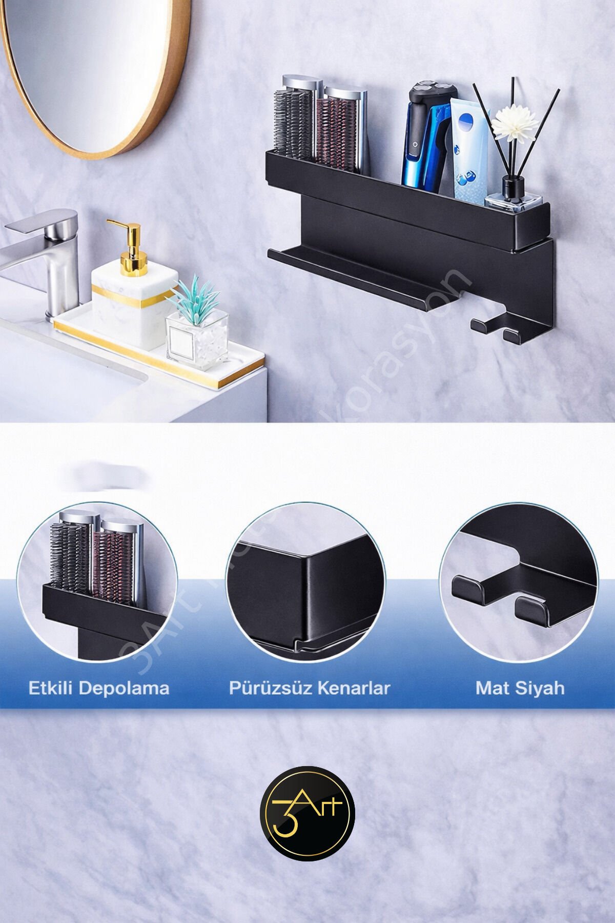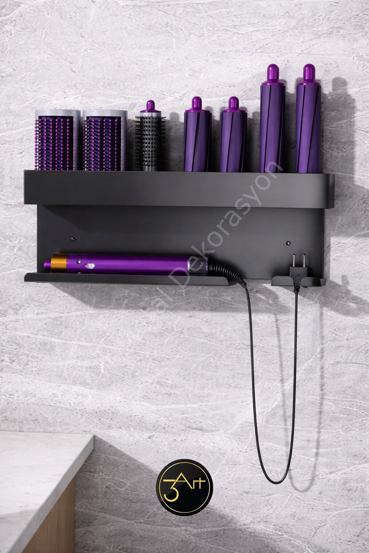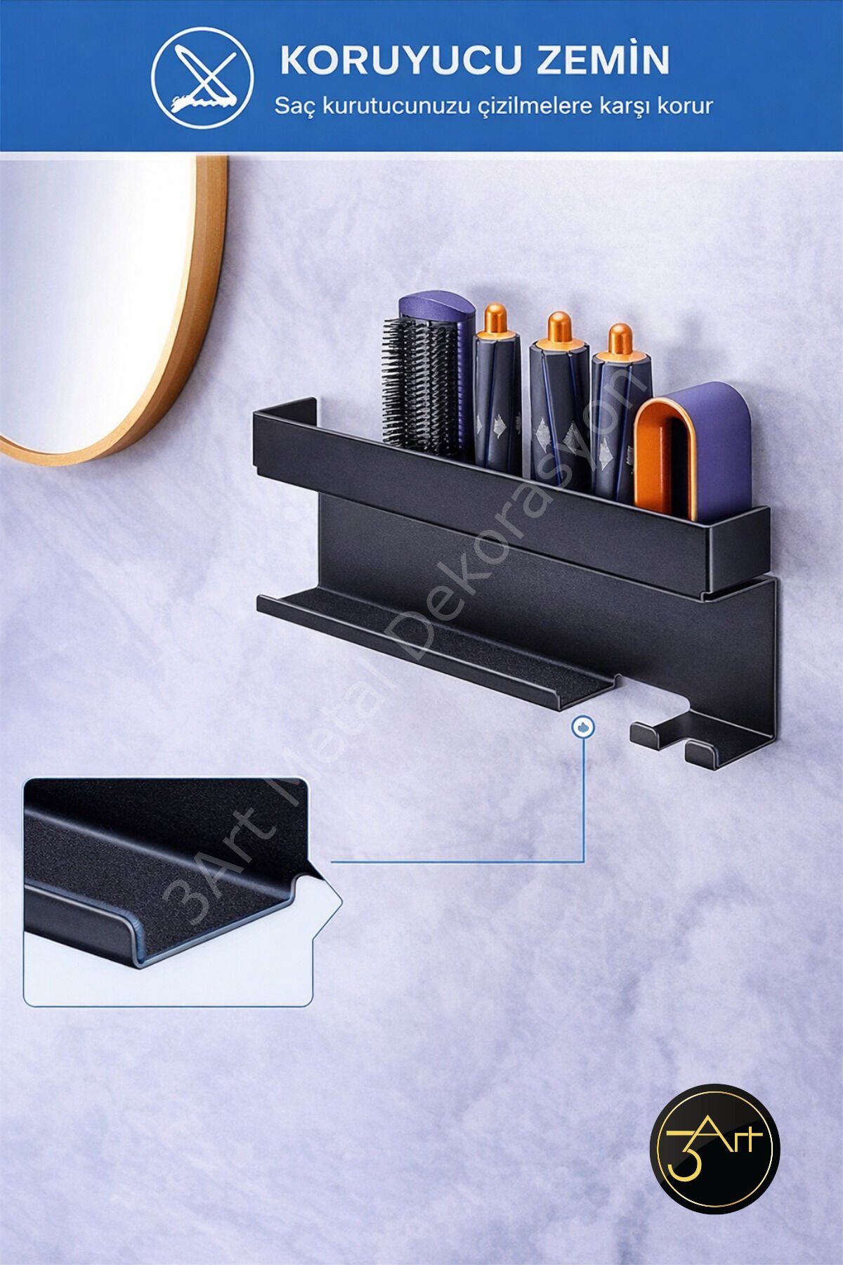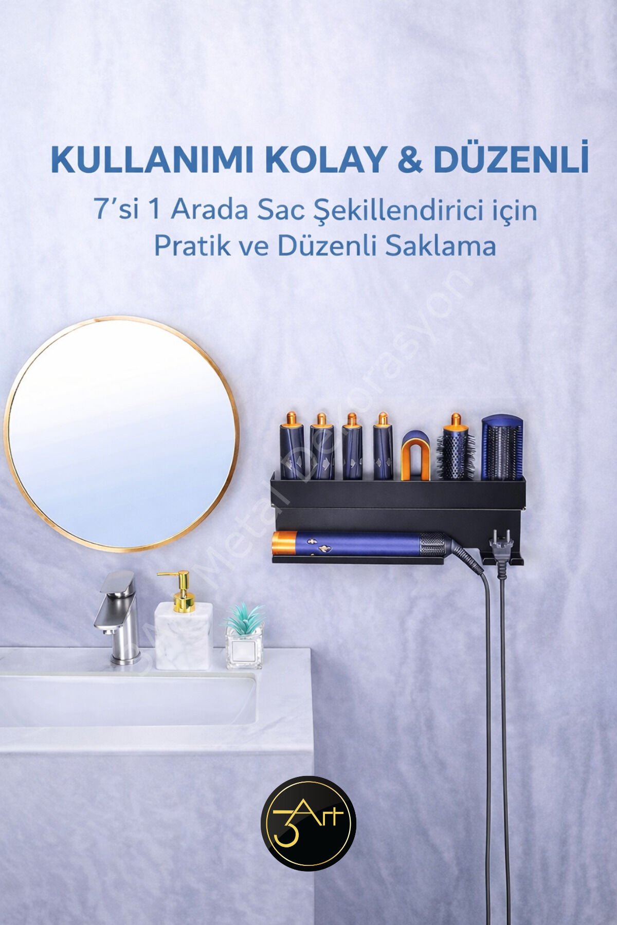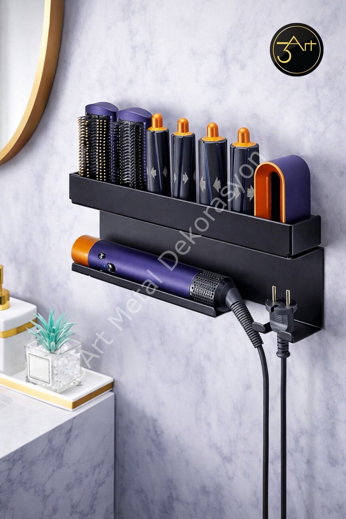 - Metal fön ve maşa askılığı, banyonuzda şık bir düzenleyici olarak işlev görür ve saç şekillendirme araçlarınızı kolayca erişebileceğiniz bir yerde tutmanızı sağlar.; - Banyo düzenleyici raf, saç aletlerinizin dağınıklığını önler ve banyonuzun daha düzenli ve ferah görünmesine katkıda bulunur.; - Nemli bir bezle kolayca temizlenebilen yapısı sayesinde hijyenik bir kullanım sunar; böylece saç şekillendirme araçlarınızın temizliğini pratik bir şekilde koruyabilirsiniz.; - Türkiye'de üretilmiş olmasıyla yerel üretim desteklenirken, kaliteli malzemelerle tasarlanmıştır.;