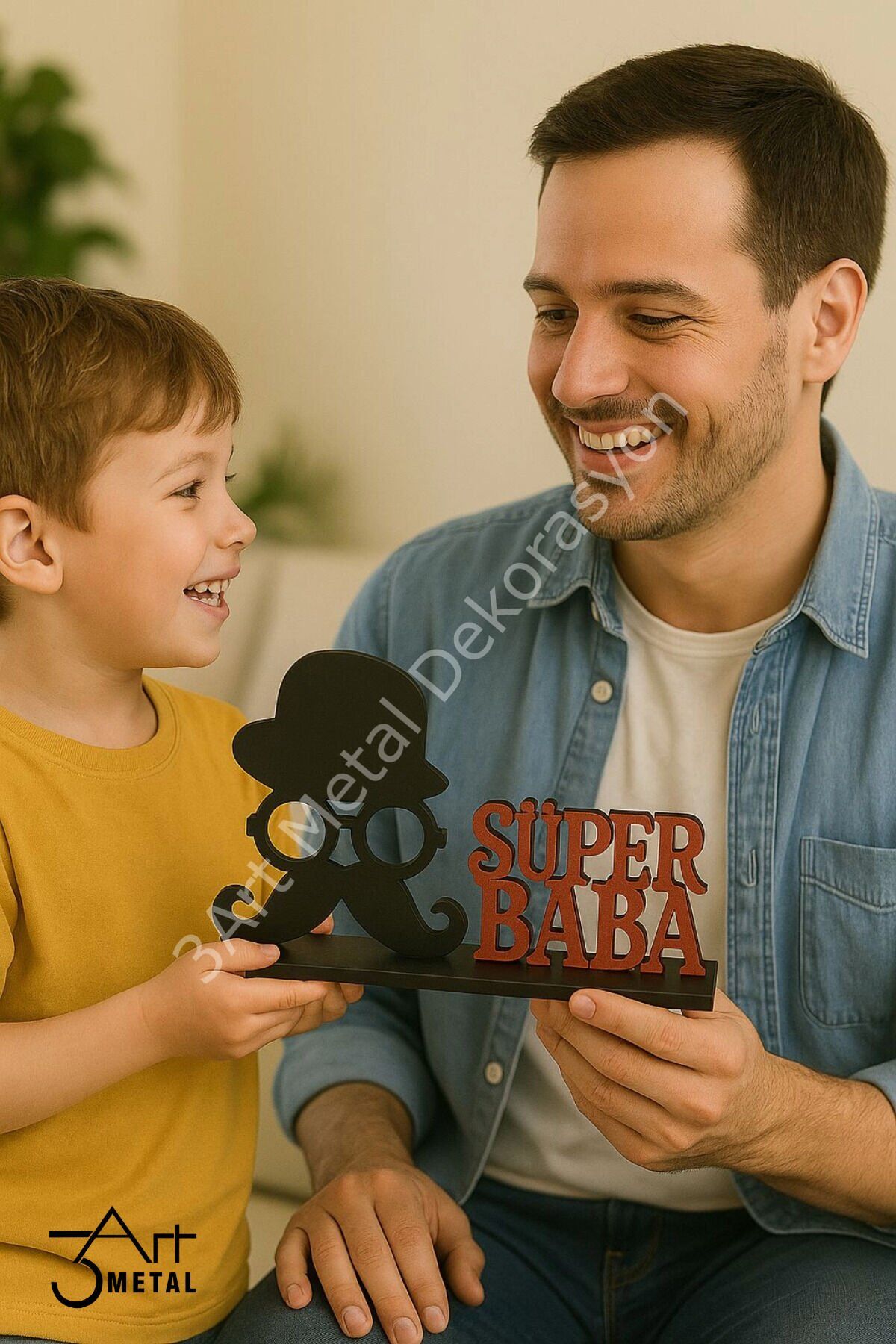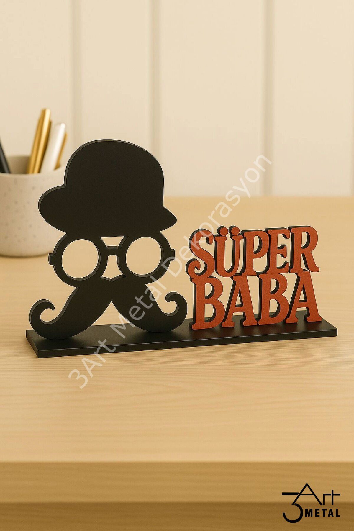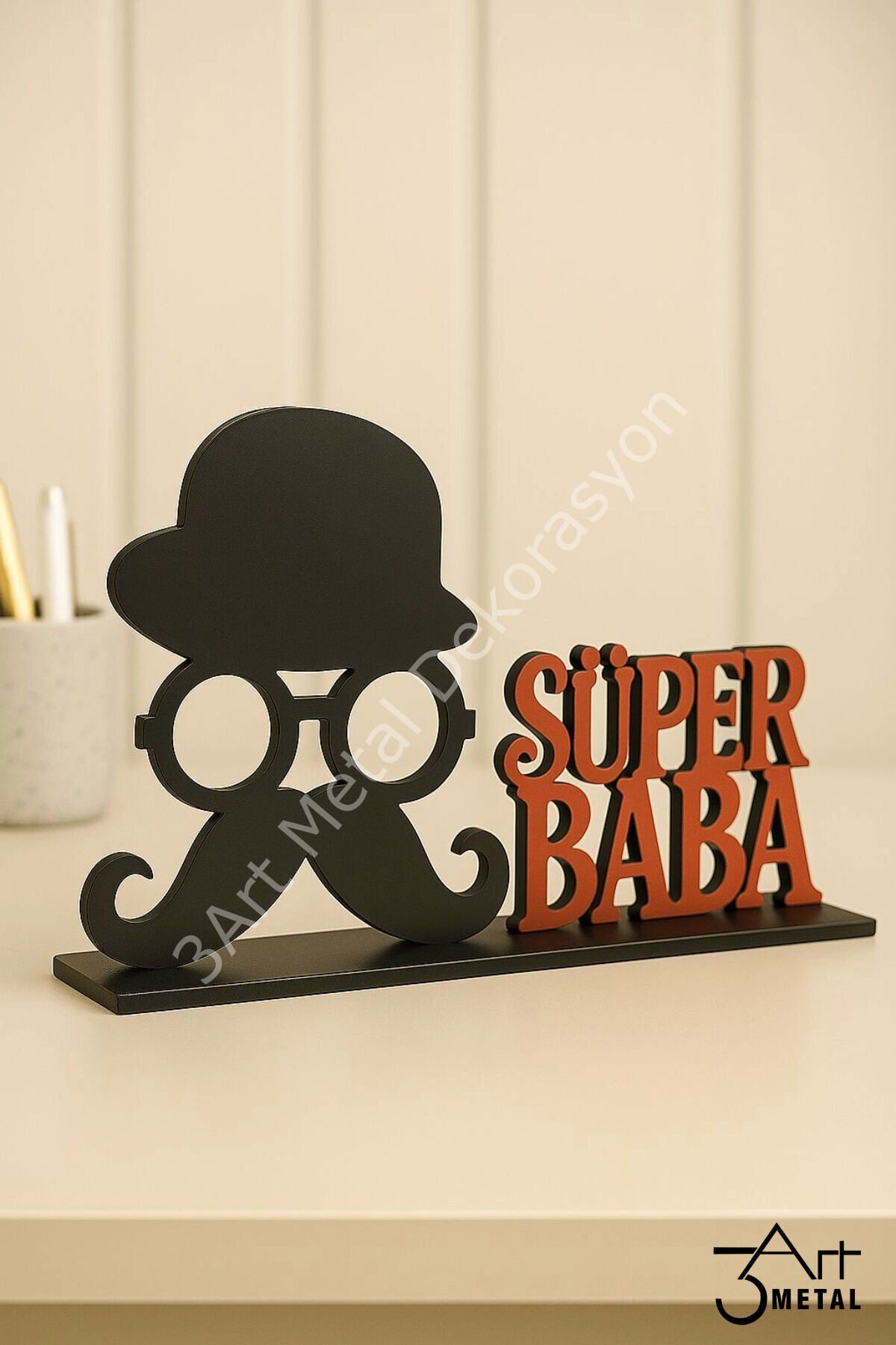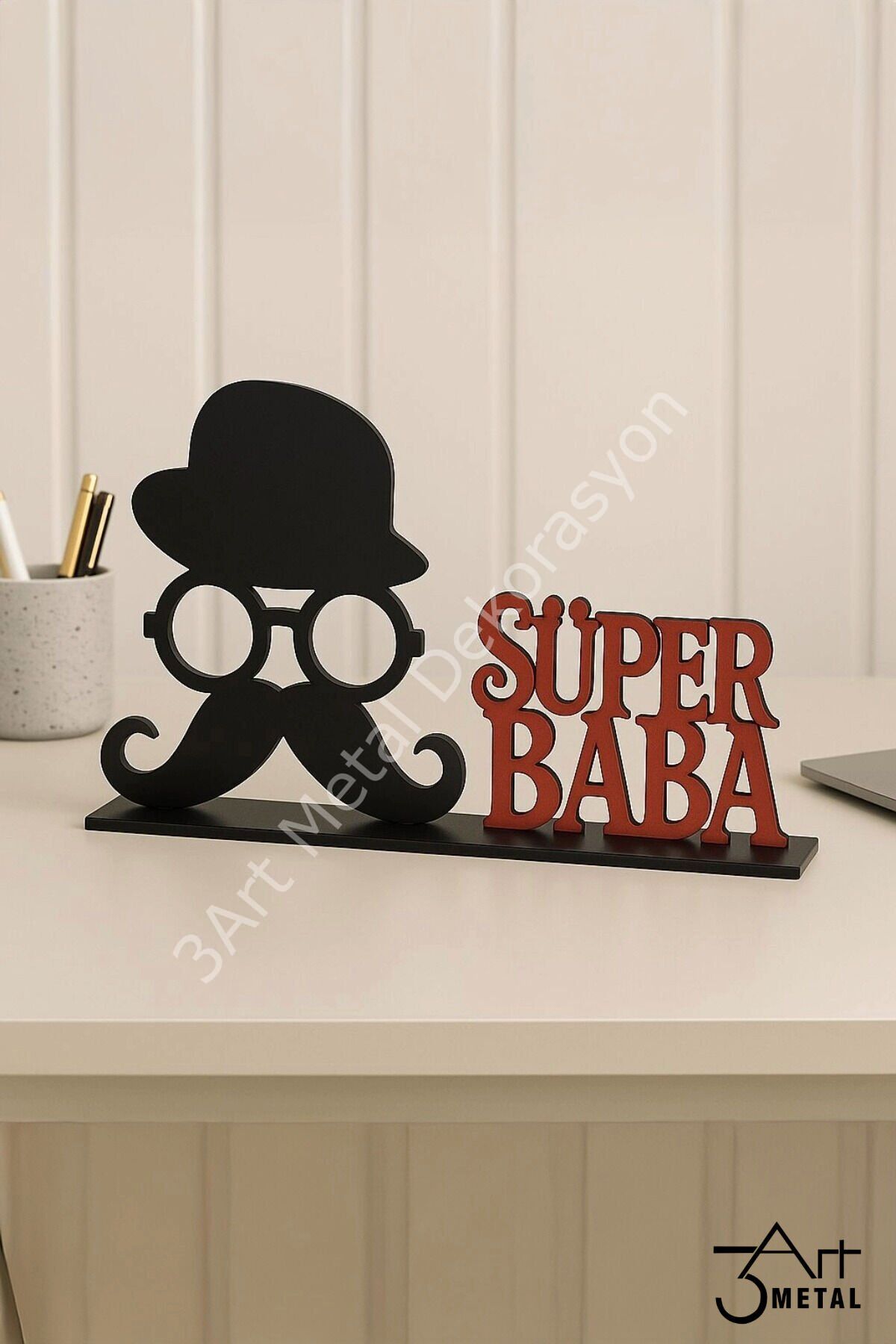 - Babalar Günü'nü özel kılmak için tasarlanmış, Süper Baba temalı metal dekoratif hediye ile babanızın gününe anlam katın.; - bu şık tasarım, hem dekoratif hem de kişisel bir dokunuş sunar.; - Üreticinin güvenilir markası 3 Art Metal Dekorasyon tarafından üretilmiş olup, kalite standartlarına uygun olarak hazırlanmıştır.; - Siyah ve kırmızı renk kombinasyonuyla dikkat çeken bu ürün, babanızın ofis veya evindeki herhangi bir köşeye kolayca uyum sağlar.; - Web renk koduna sahip olan bu dekoratif obje, modern ve şık görünümüyle mekanınıza estetik bir katkıda bulunur.; Babalar Günü için unutulmaz bir hediye arayanlara özel! Lazer kesim tekniğiyle tamamen metalden üretilmiş bu dekoratif masaüstü figür, şapkalı, gözlüklü ve bıyıklı ikonik tasarımıyla “SÜPER BABA” figürünü modern bir şekilde yansıtıyor.; Ürün Özellikleri: • Tamamen metalden üretilmiştir • Mat siyah figür ve kırmızı yazı tasarımı • Şık ve dayanıklı masaüstü dekoru • Özel günlerde hediye alternatifi olarak idealdir Ofiste, evde ya da çalışma masasının üzerinde sergilenebilecek bu anlamlı hediye ile babanıza kendisini süper hissettirin! Babalar Günü, doğum günü veya teşekkür hediyesi için mükemmel bir tercih.